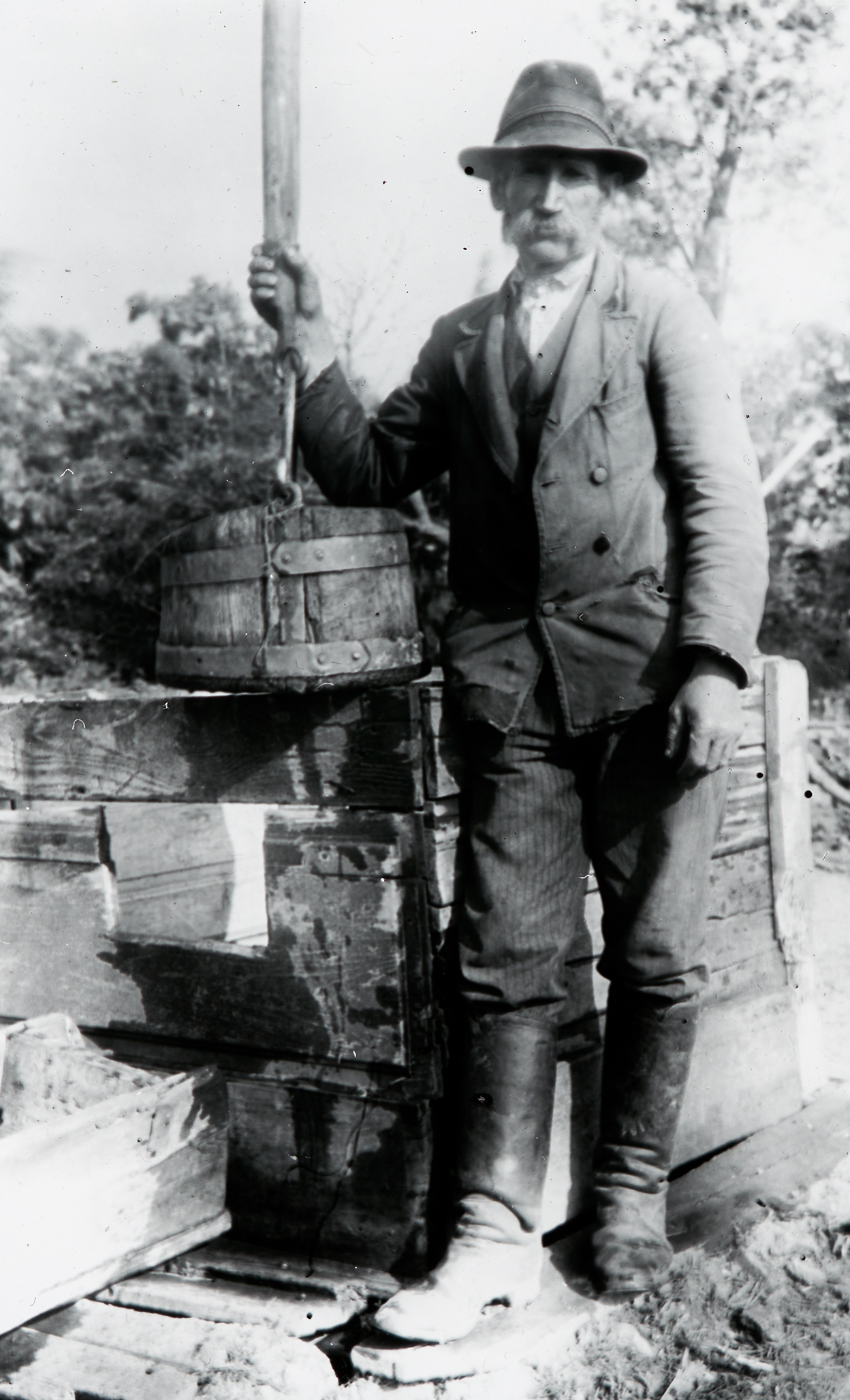 Dieser Mann hält in seiner rechten Hand ein Werkzeug. Er stützt seinen Arm auf einem Fass ab.