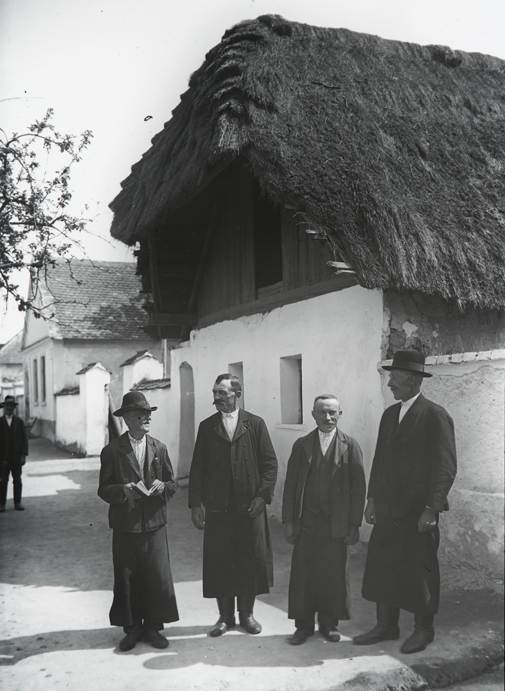 Vier Männer spazieren in schicker Kleidung über einen Dorfweg. Hinter ihnen erkennt man Häuser und einen weiteren Mann mit Hut.