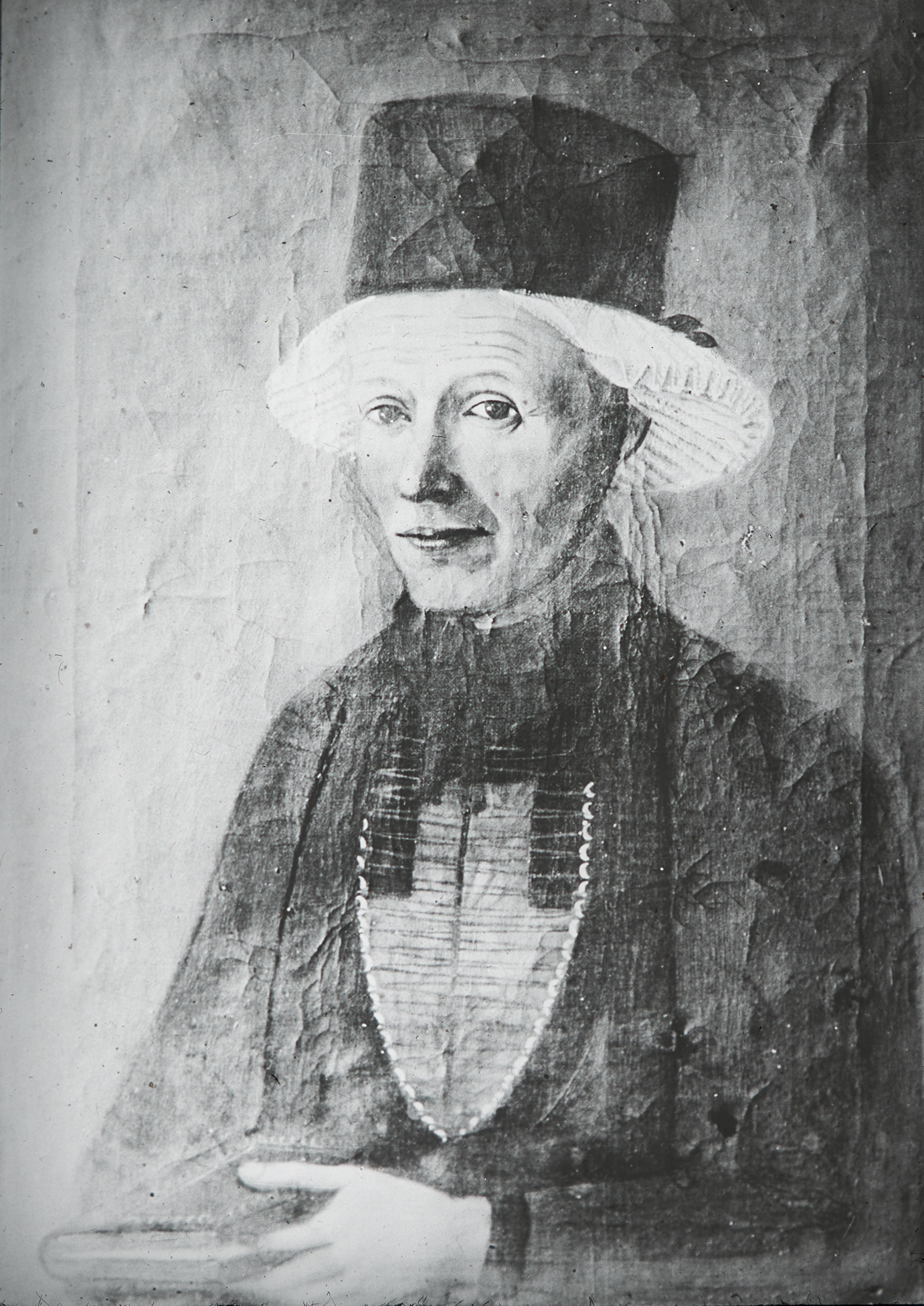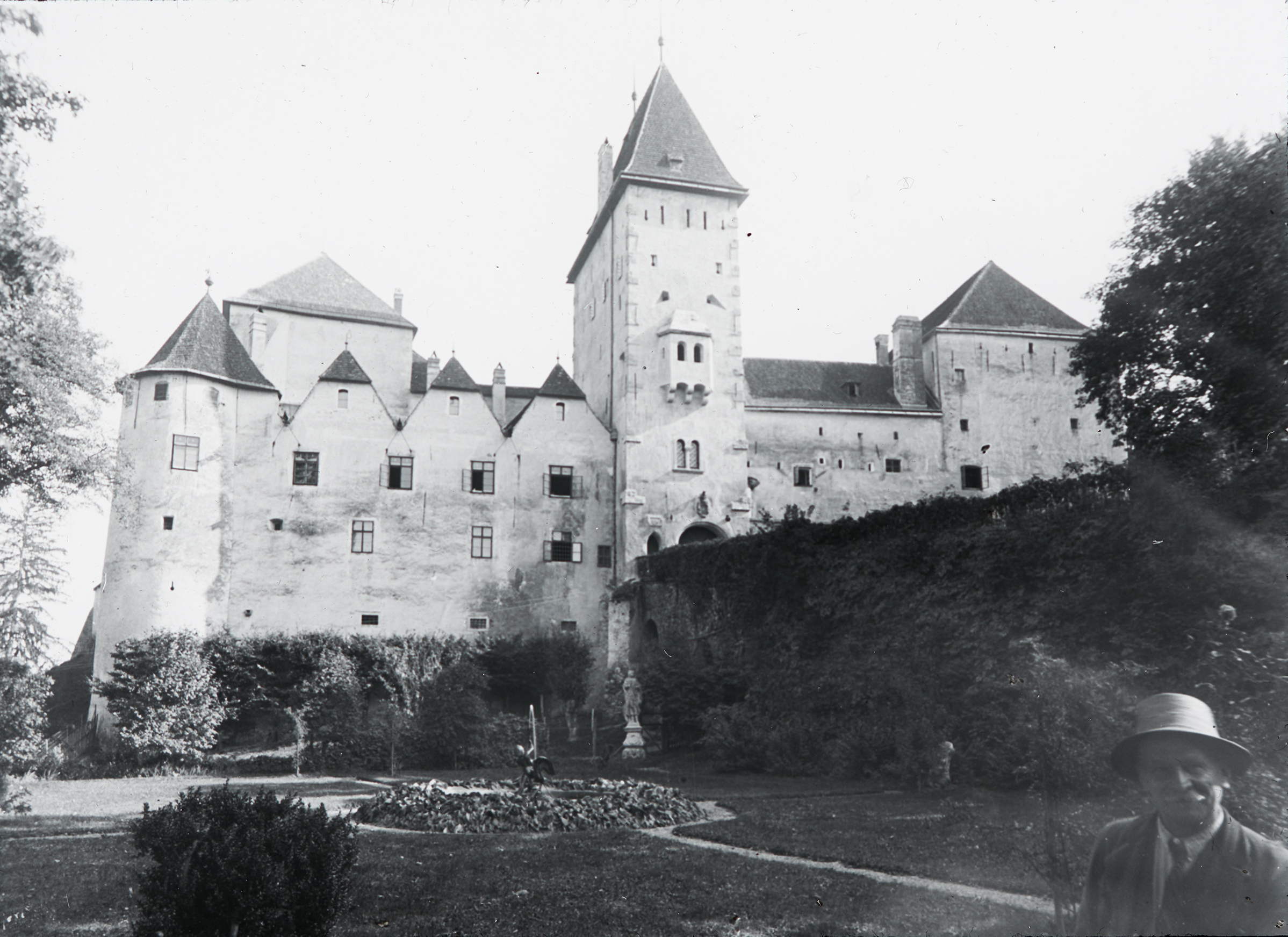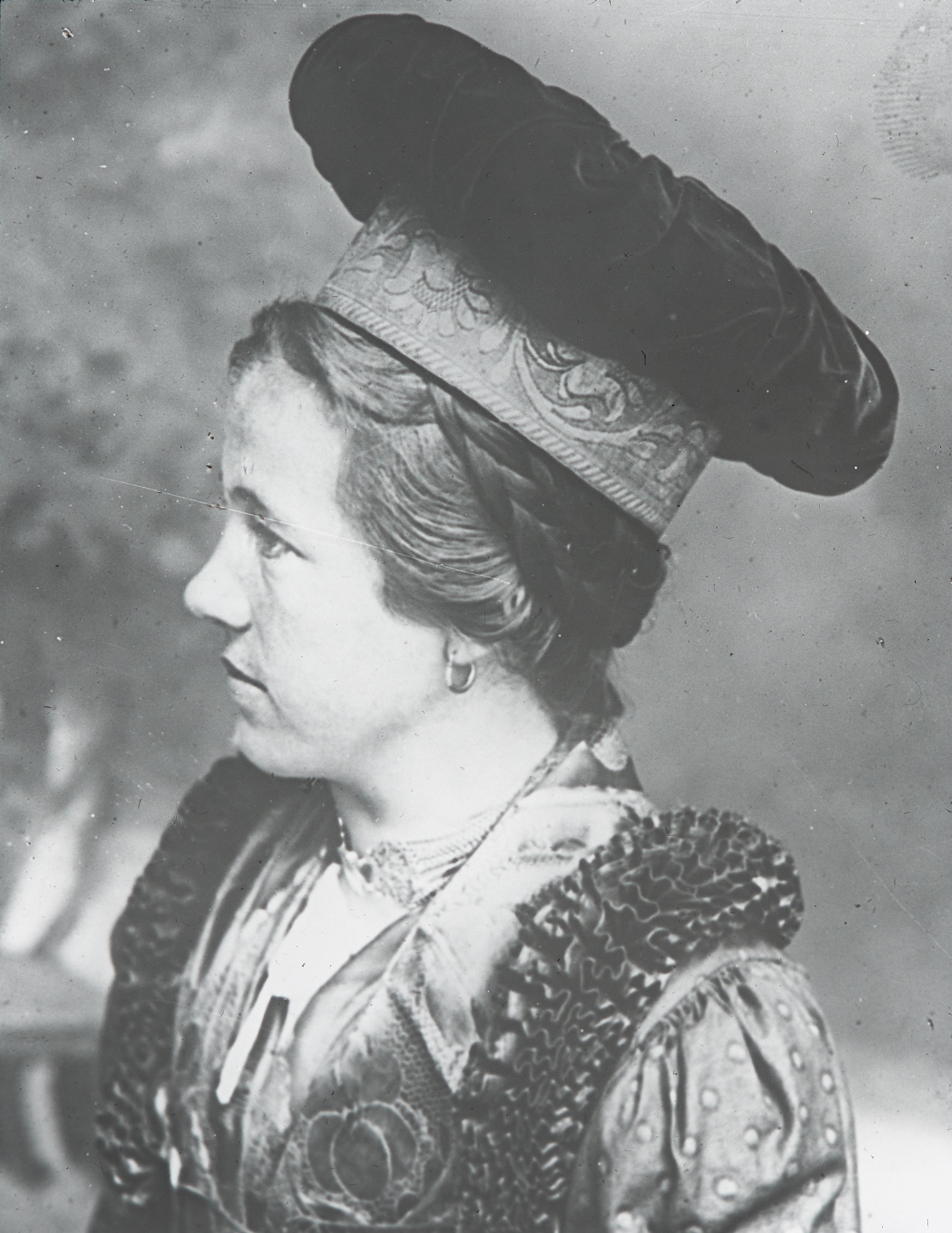 Diese Frau, gekleidet in Tracht, hat ihre Hände ineinander verschränkt. Im Hintergrund sieht man ein Burggebäude.