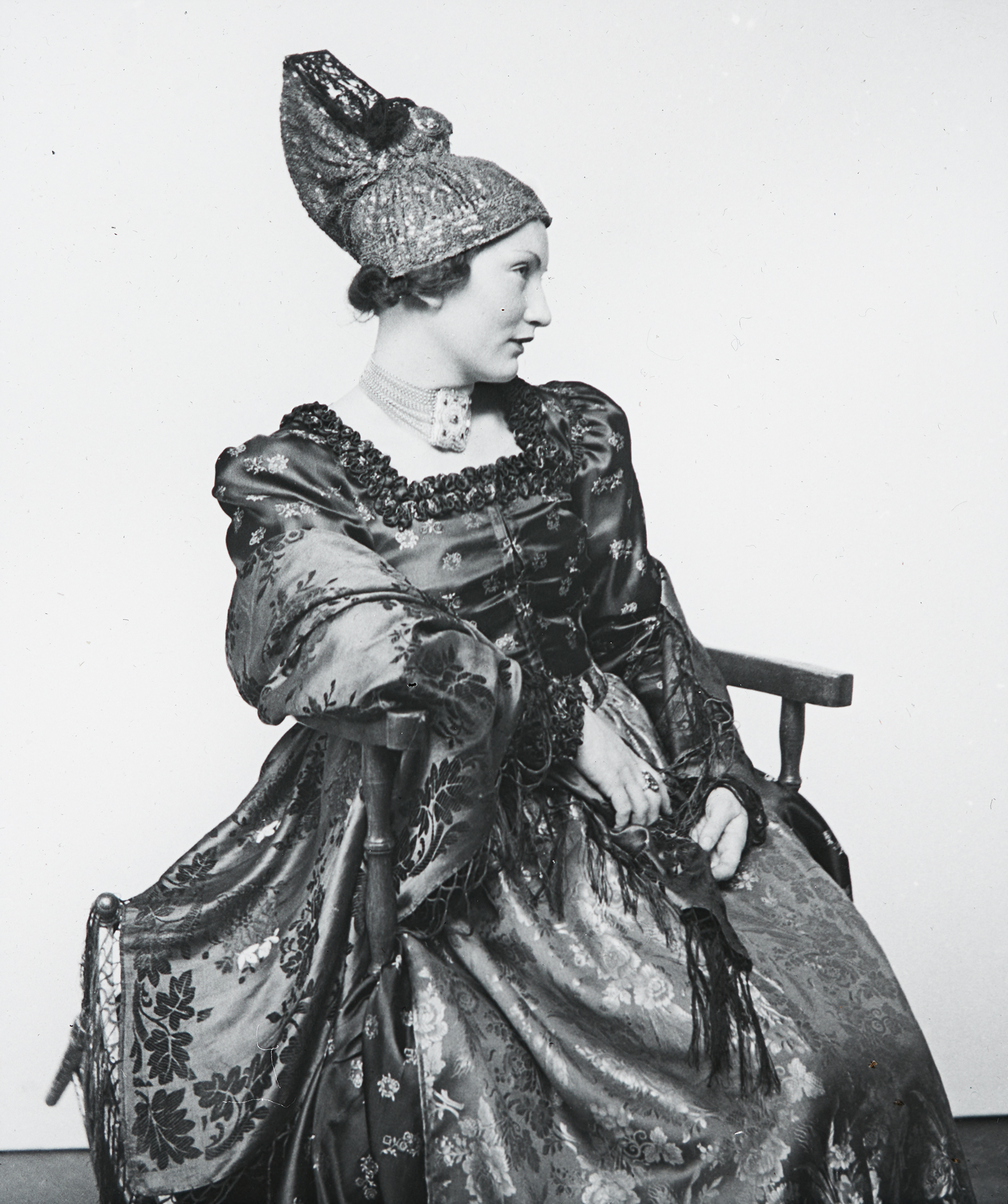 Diese Frau trägt eine Goldhaube am Kopf. Dies ist ein traditioneller Hut, den sie zu ihrer festlichen Kleidung trägt.