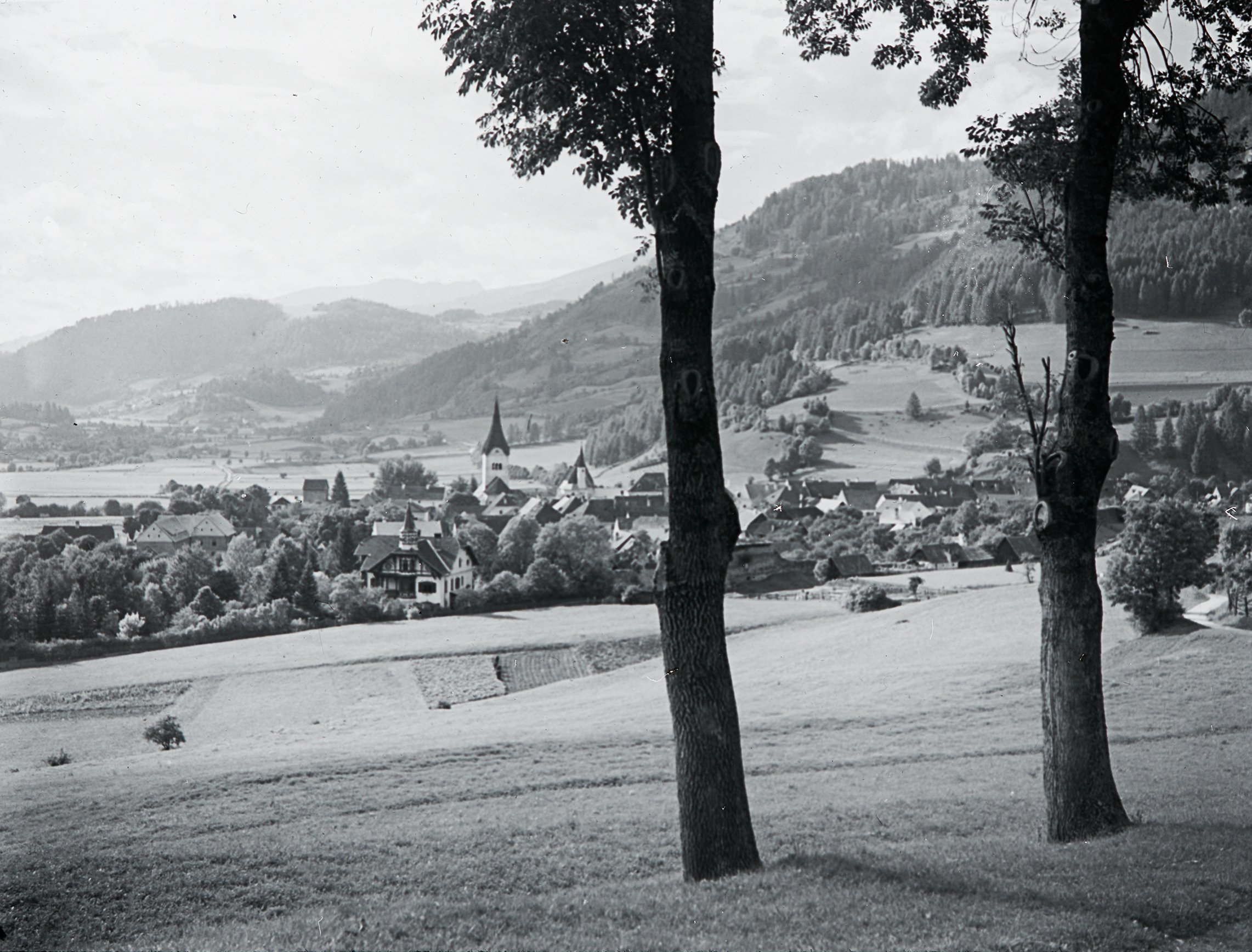 Zu sehen ist eine Häusersiedlung in einem Dorf. Im Hintergrund erkennt man einen Kirchturm, dahinter sieht man einen großen Wald.