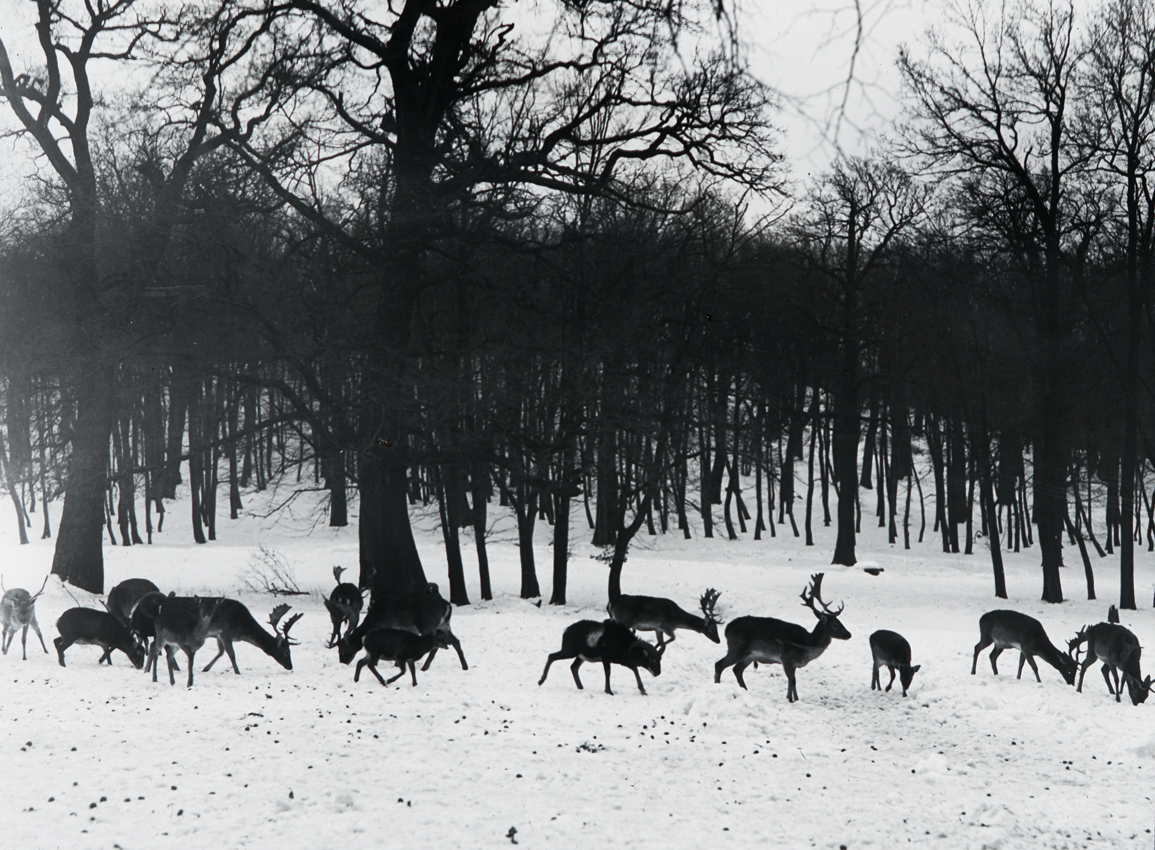 Dieses Hirschrudel bewegt sich durch den winterlichen Wald.