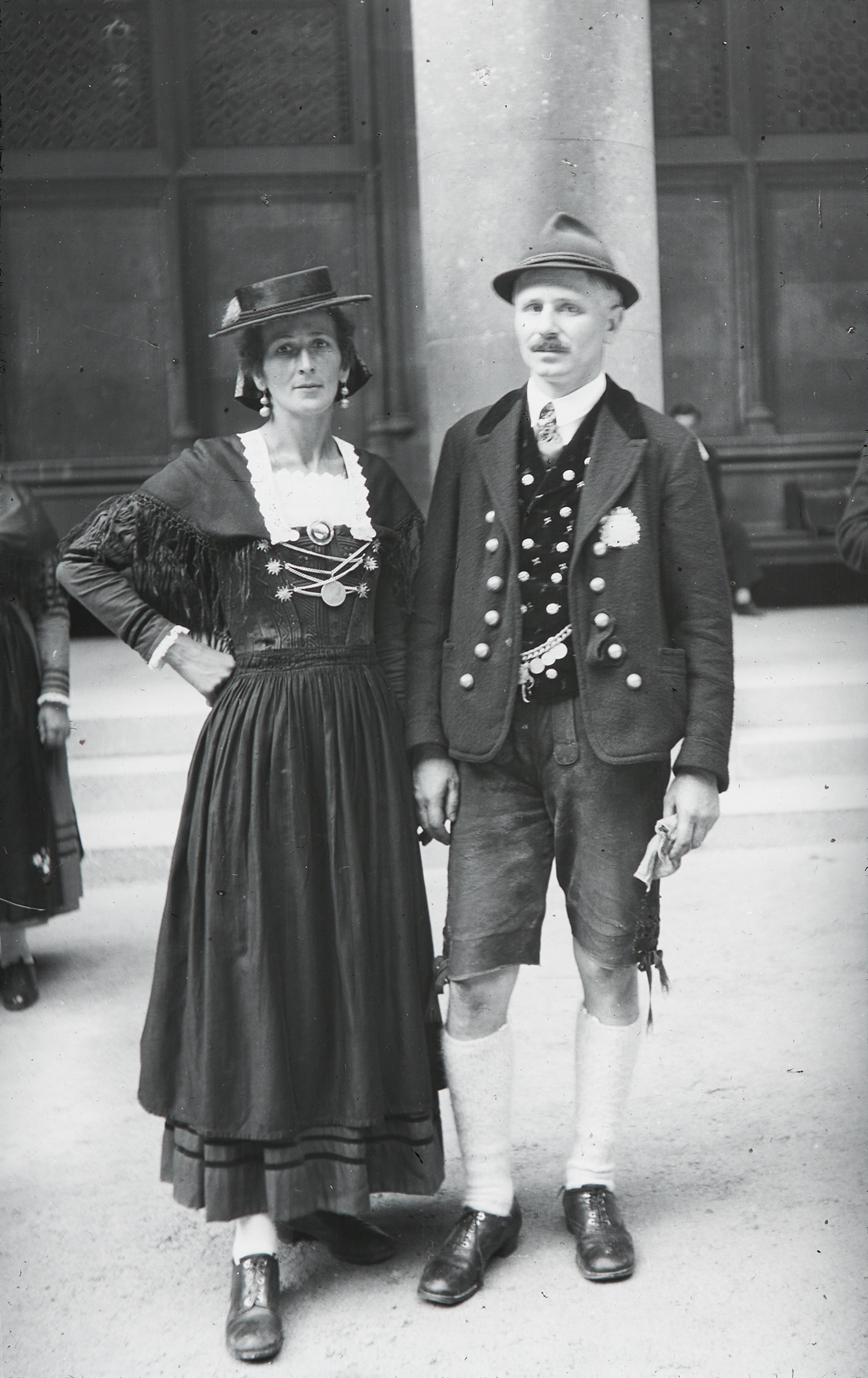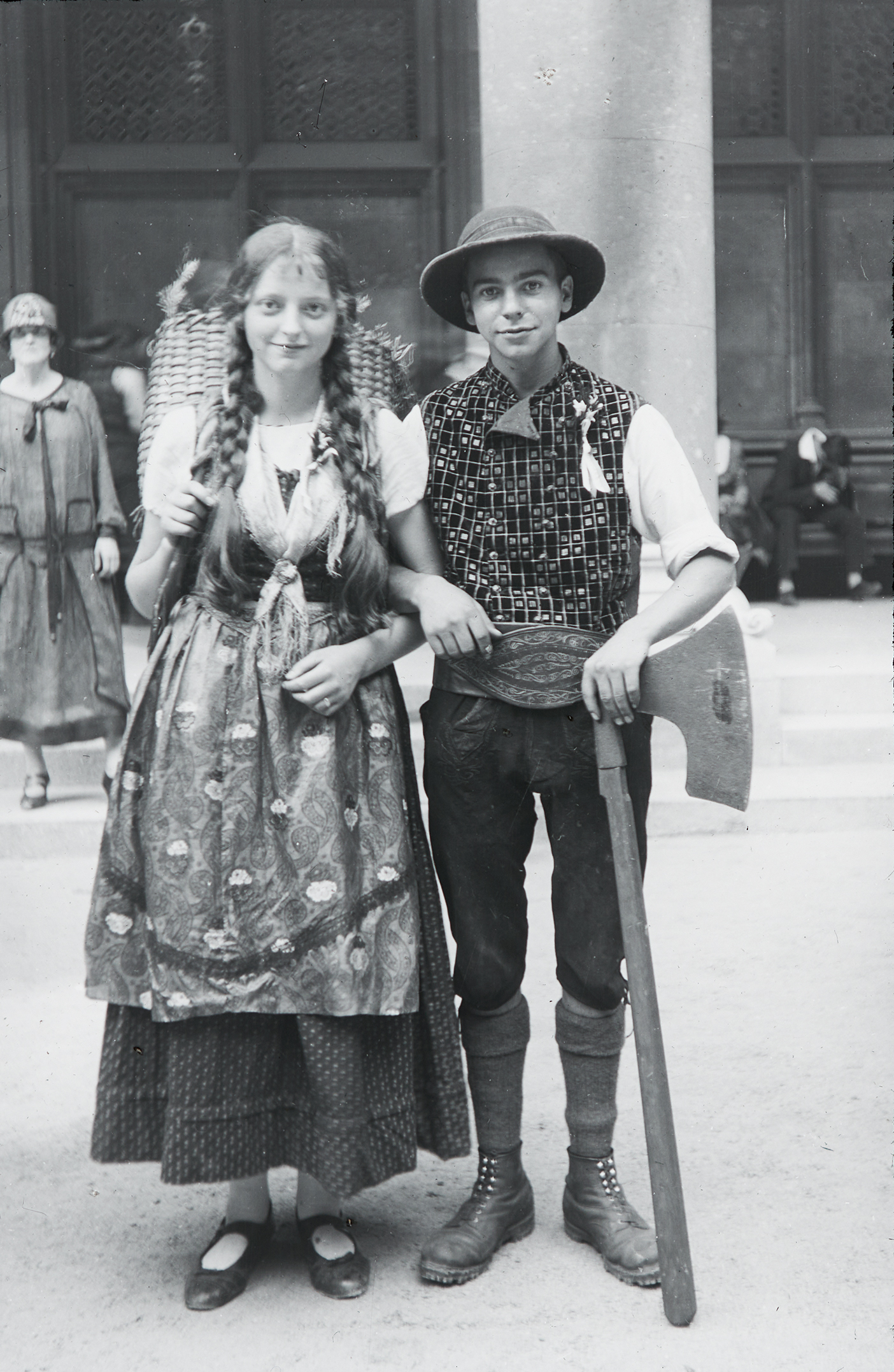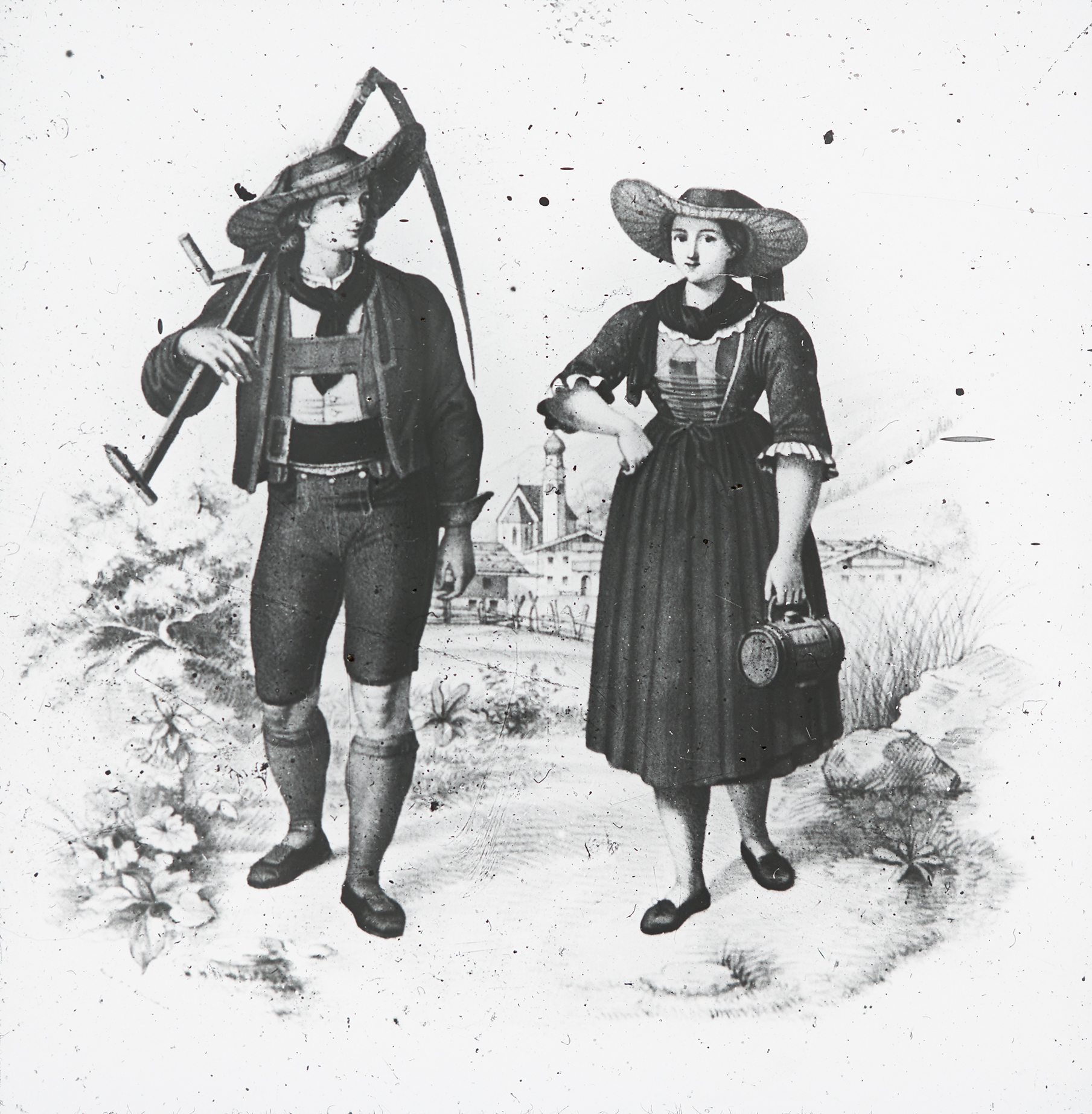 Dieses Paar trägt traditionelle Trachtenkleidung. Der Mann stützt sich auf seine Axt, die Frau trägt einen geflochtenen Korb am Rücken.