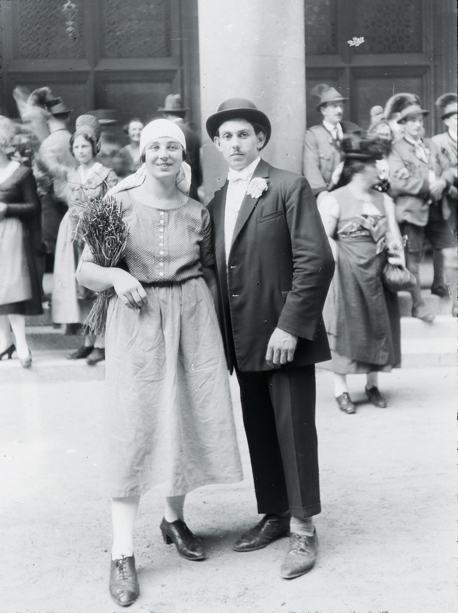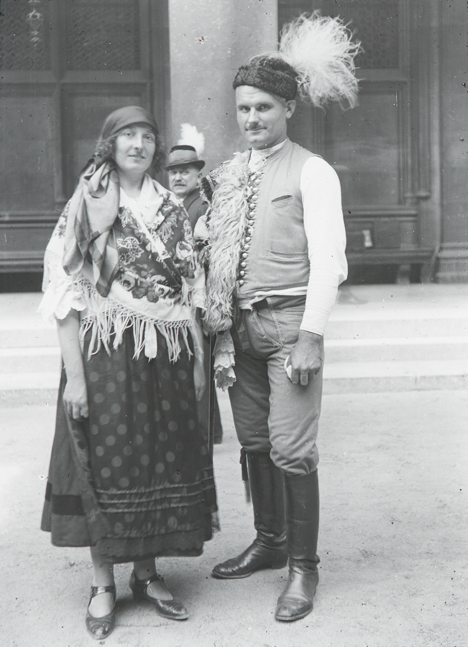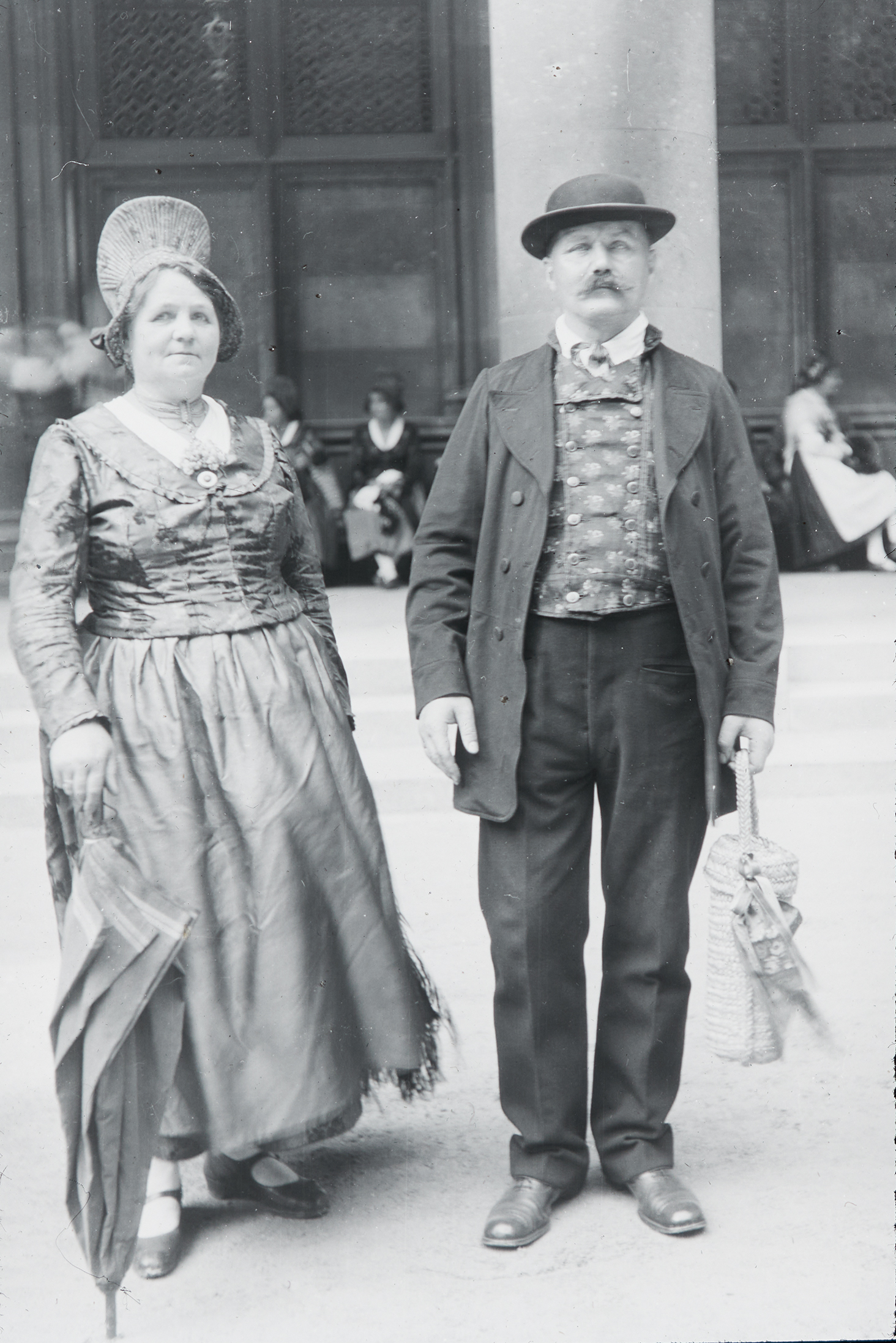Dieses Paar trägt traditionelle Trachtenkleidung. Der Mann stützt sich auf seine Axt, die Frau trägt einen geflochtenen Korb am Rücken.