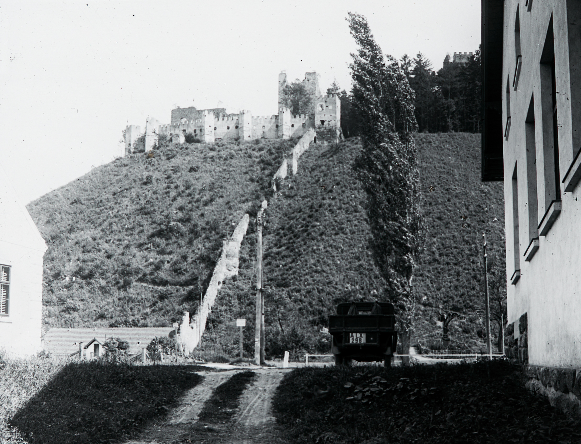 In diesem Ort steht auf dem Hügel eine Burg. Unter der Burg führt eine Straße entlang durch die Gemeinde. Im Hintergrund erkennt man eine waldige Berglandschaft.