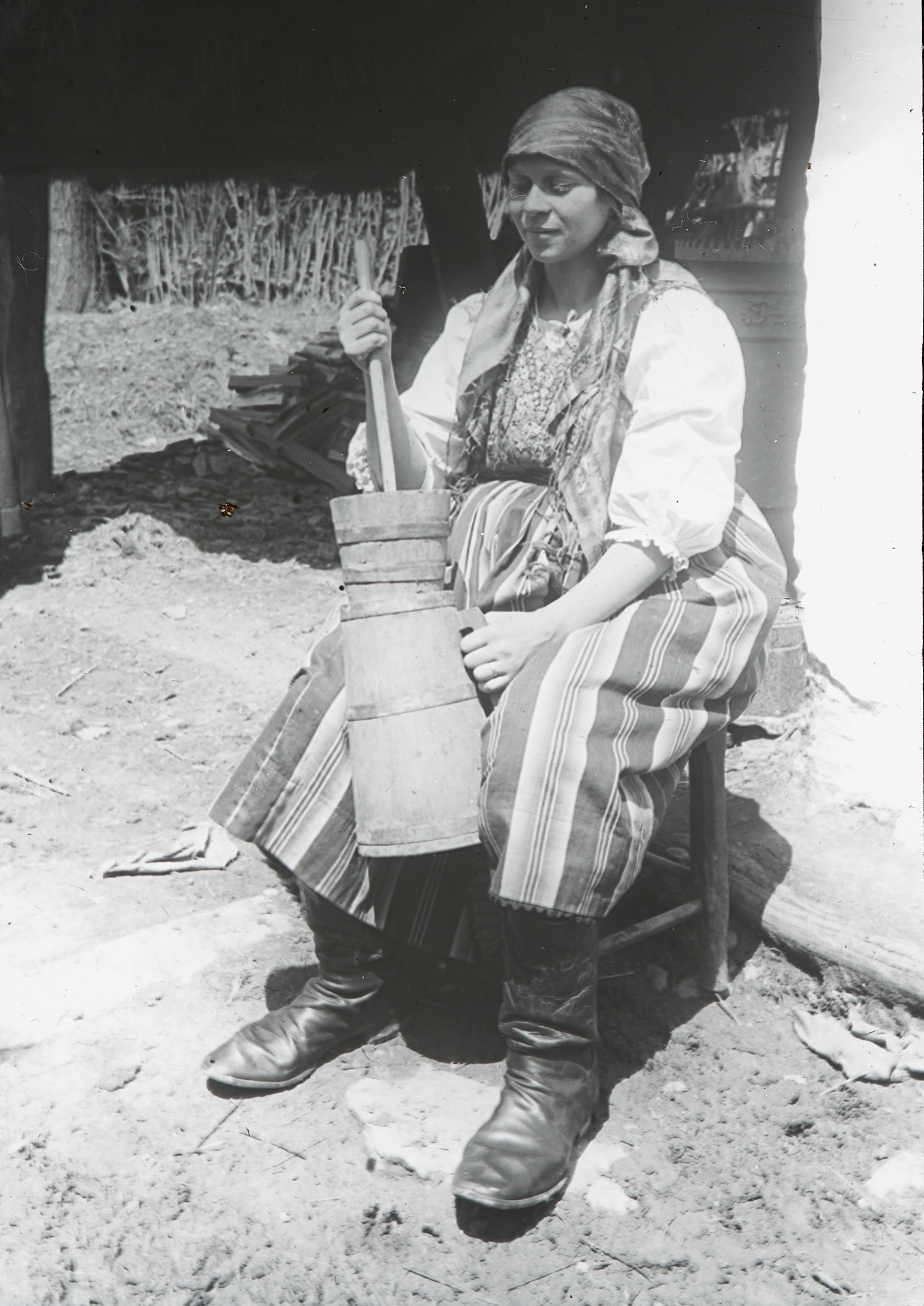 Diese Frau stochert mit einem Stock in einem Behältnis, während sie auf einem Schemel sitzt.