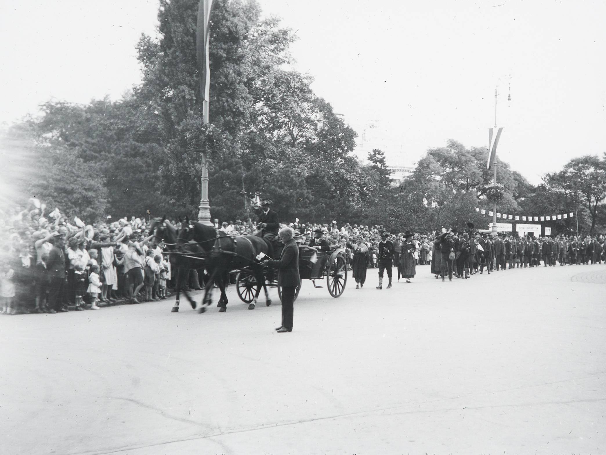 Diese Parade wird von einem Fiaker angeführt. Dahinter stehen die Leute in einer Reihe.