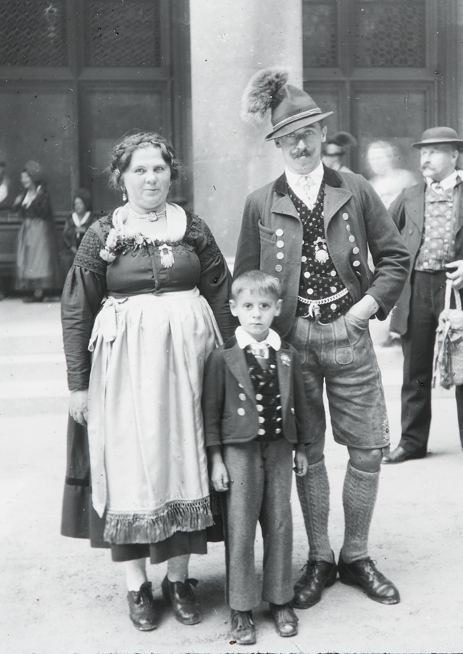 Diese dreiköpfige Familie trägt Trachten, traditionelle österreichische Bekleidung.
