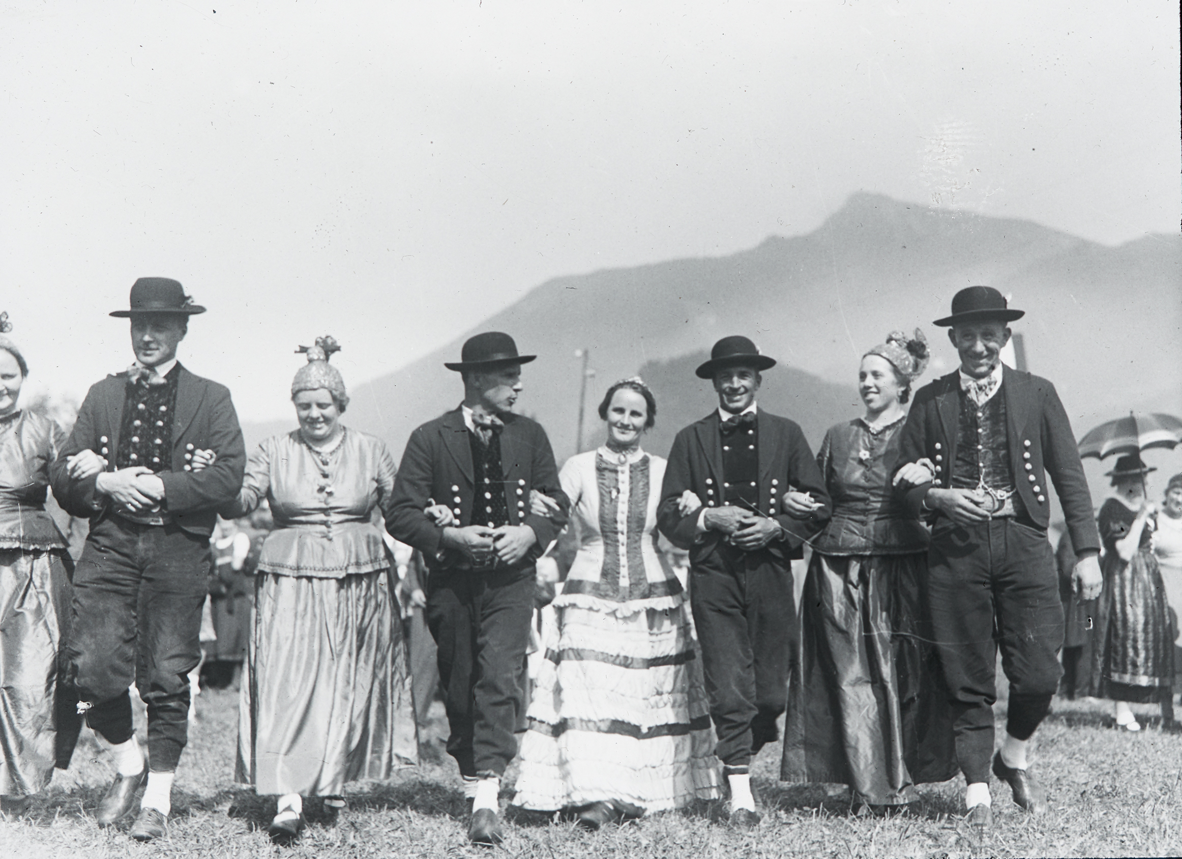 Diese Freunde gehen in einer Reihe miteinander. Sie haben die Arme ineinander verschränkt und tragen Trachtenkleidung.