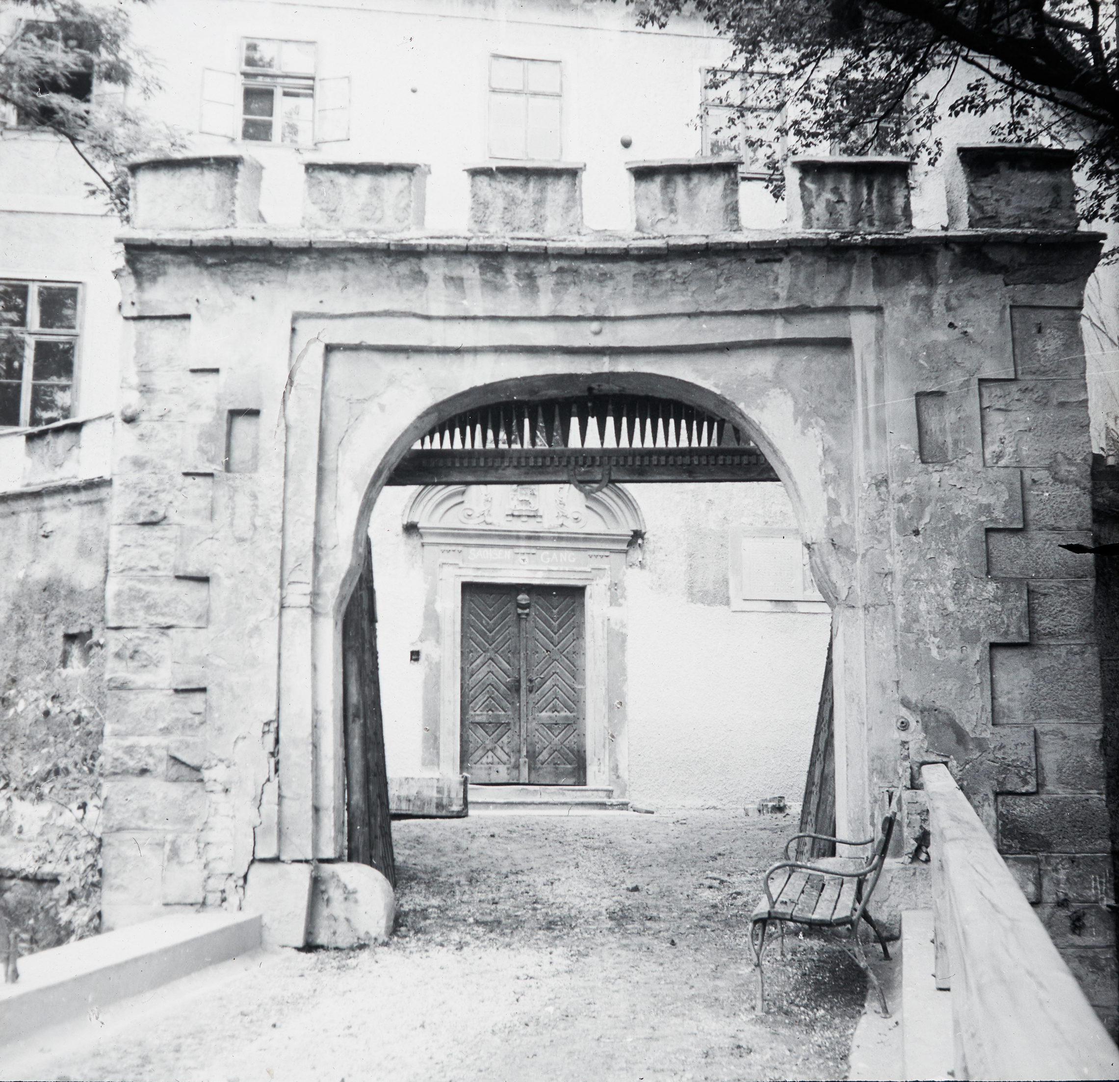 Dieses Eingangstor führt durch eine Mauer. Davor steht eine Parkbank.