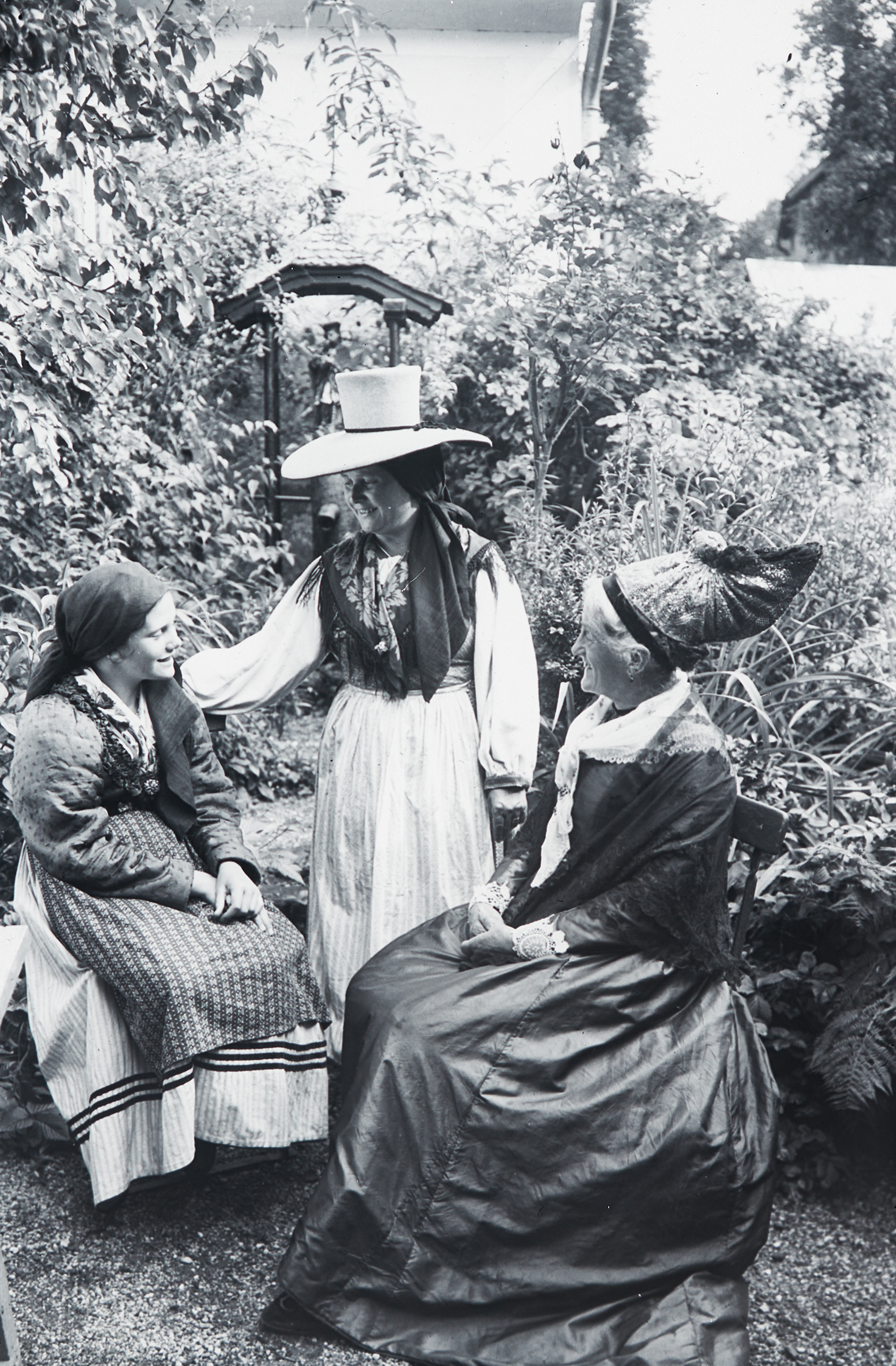 Hier verbringen drei Frauen aus unterschiedlichen Generationen unter einem Baum miteinander ihre Zeit. Sie tragen traditionelle österreichische Kleidung, die älteste Frau trägt eine Goldhaube.