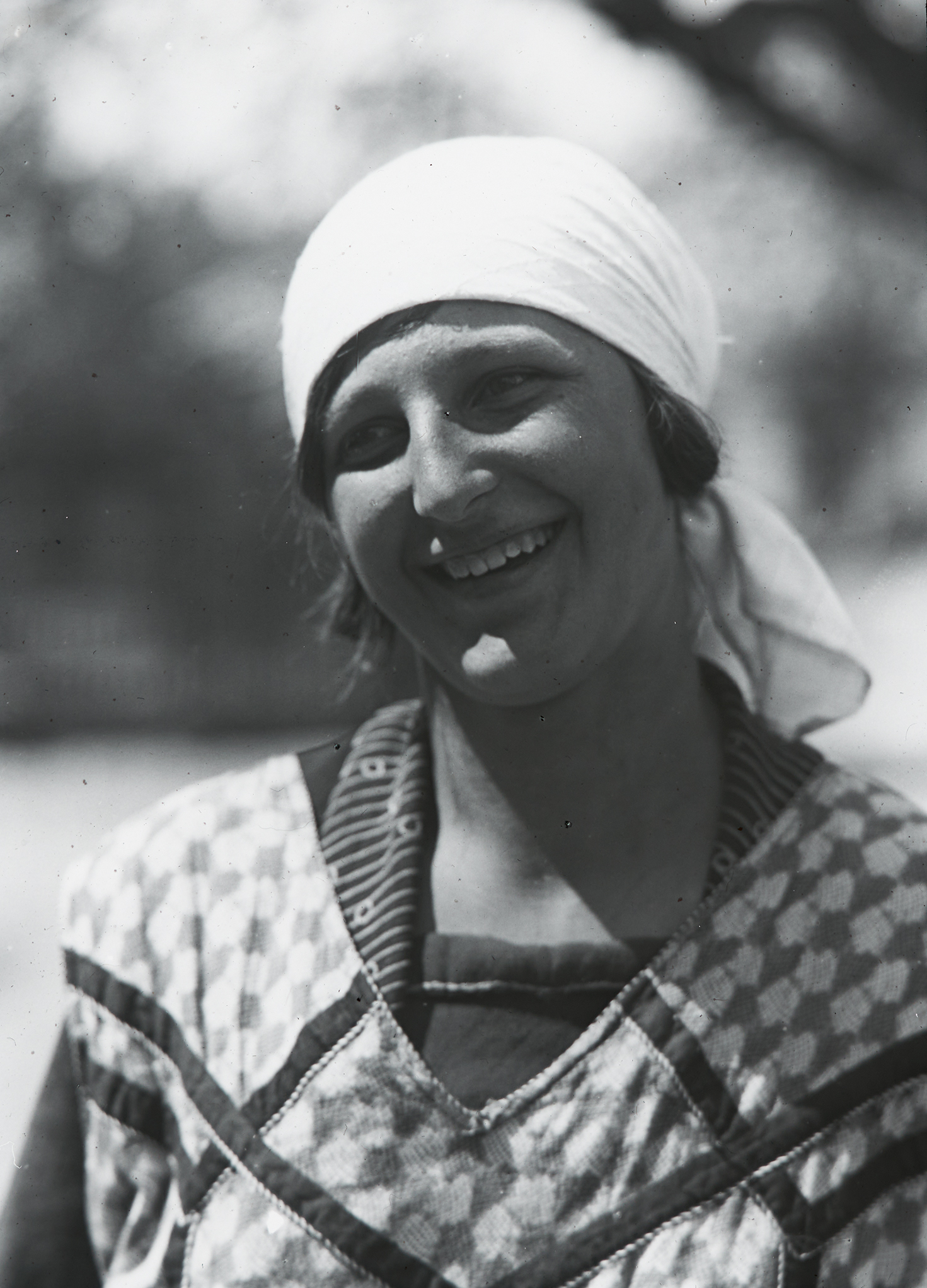 Diese Frau trägt ein Kopftuch und lächelt, während sie fotografiert wird.