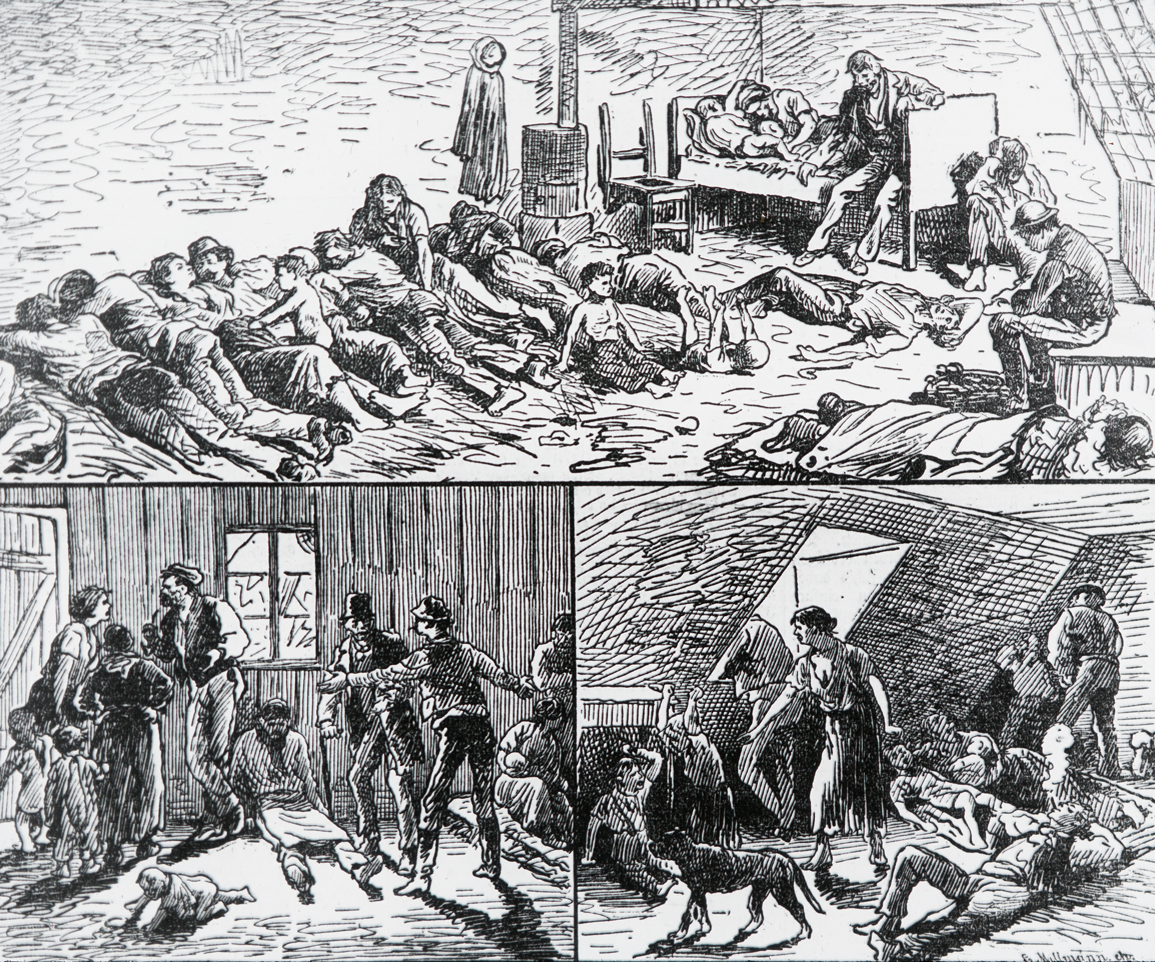 Manche der hier abgebildeten Menschen schlafen auf dem Boden, andere streiten sich. Unter den Menschen sind auch Kinder.