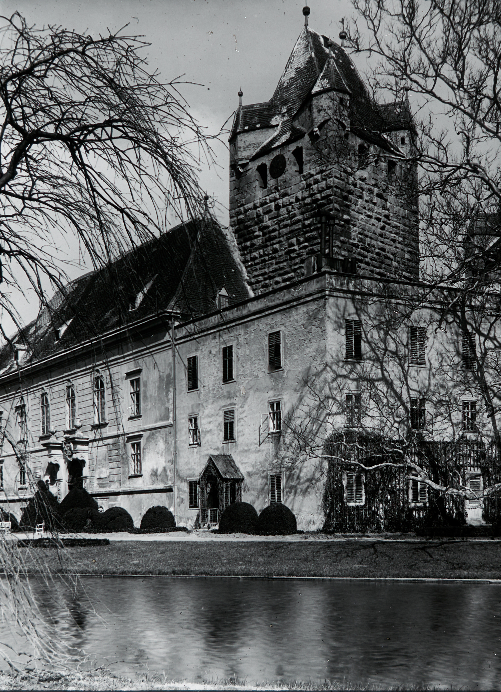 Die Schlossruine Pottendorf befindet sich im niederösterreichischen Pottendorf. Vor dem Schloss befindet sich eine Grünfläche und eine Wasseranlage.