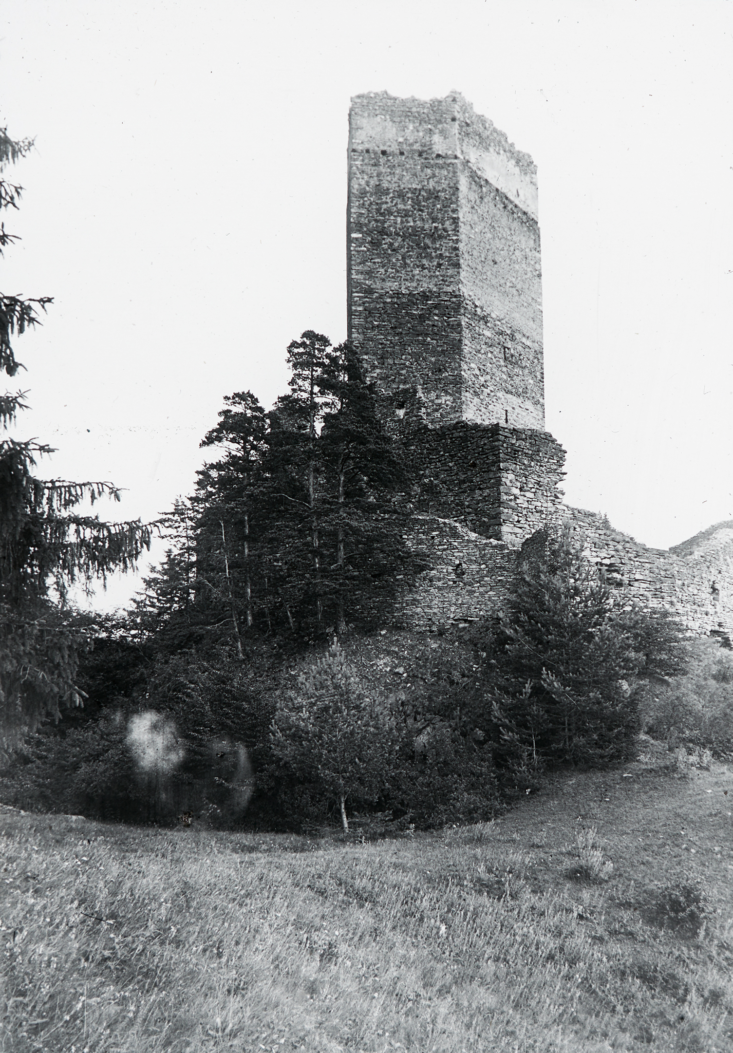 Aus diesen Bäumen ragen die Mauern eines Ruinenturms heraus.