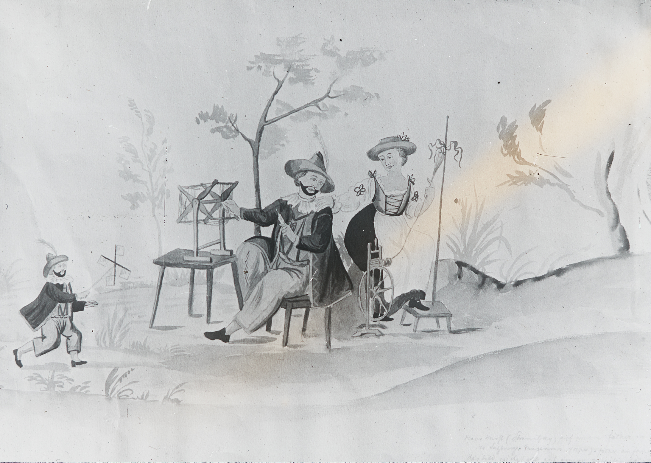 Die zwei Menschen in der Mitte des Bildes erledigen Webarbeit. Von links läuft ein Mann mit Bart auf die Beiden zu.