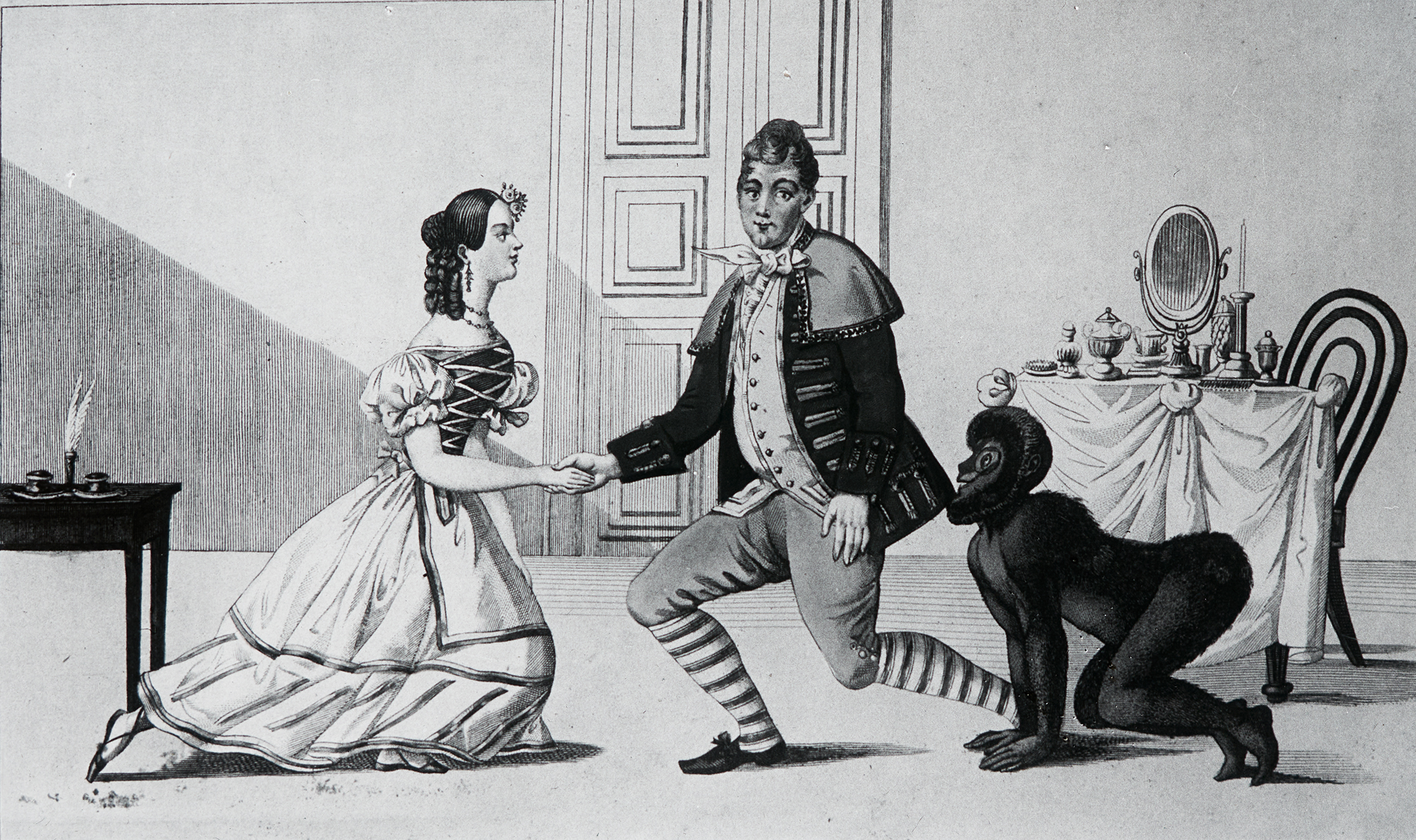 Nestroy, Dielen und Klischnig in ihren Rollen in Nestroys Posse "Der Affe und der Bräutigam".