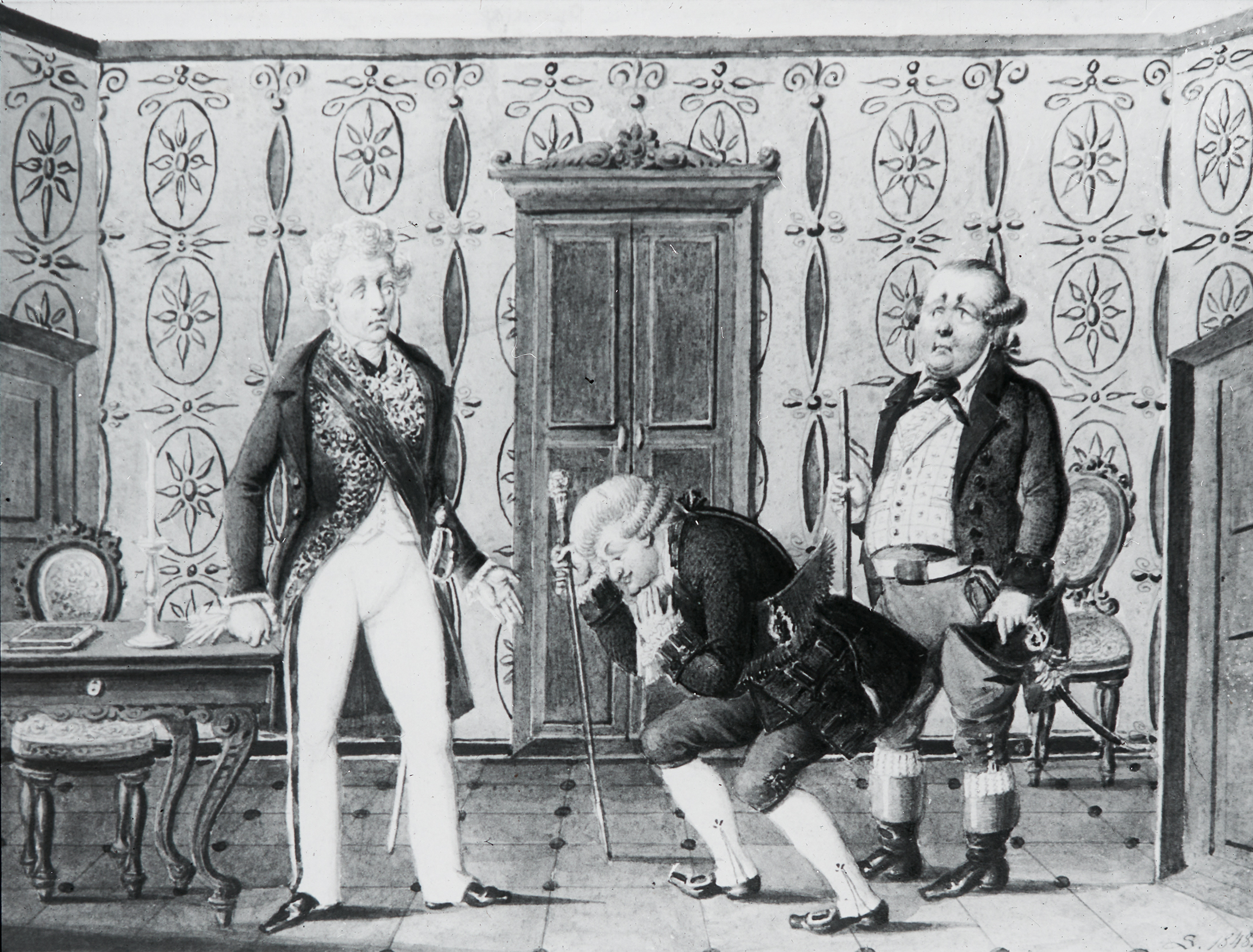 Johann Nestroy als Eberhard Ultra, verkleidet als Metternich, Wenzel Scholz als Klaus und Louis Groh als Bürgermeister in Freiheit in Krähwinkel.