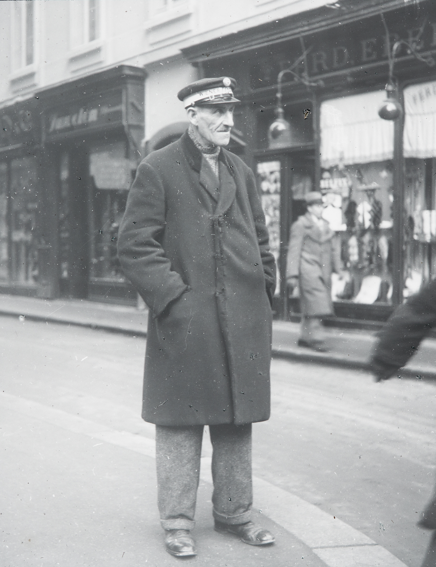 Dieser Mann steht auf dem Gehsteig, gekleidet in einen Mantel. Am Kopf trägt er eine Kappe.