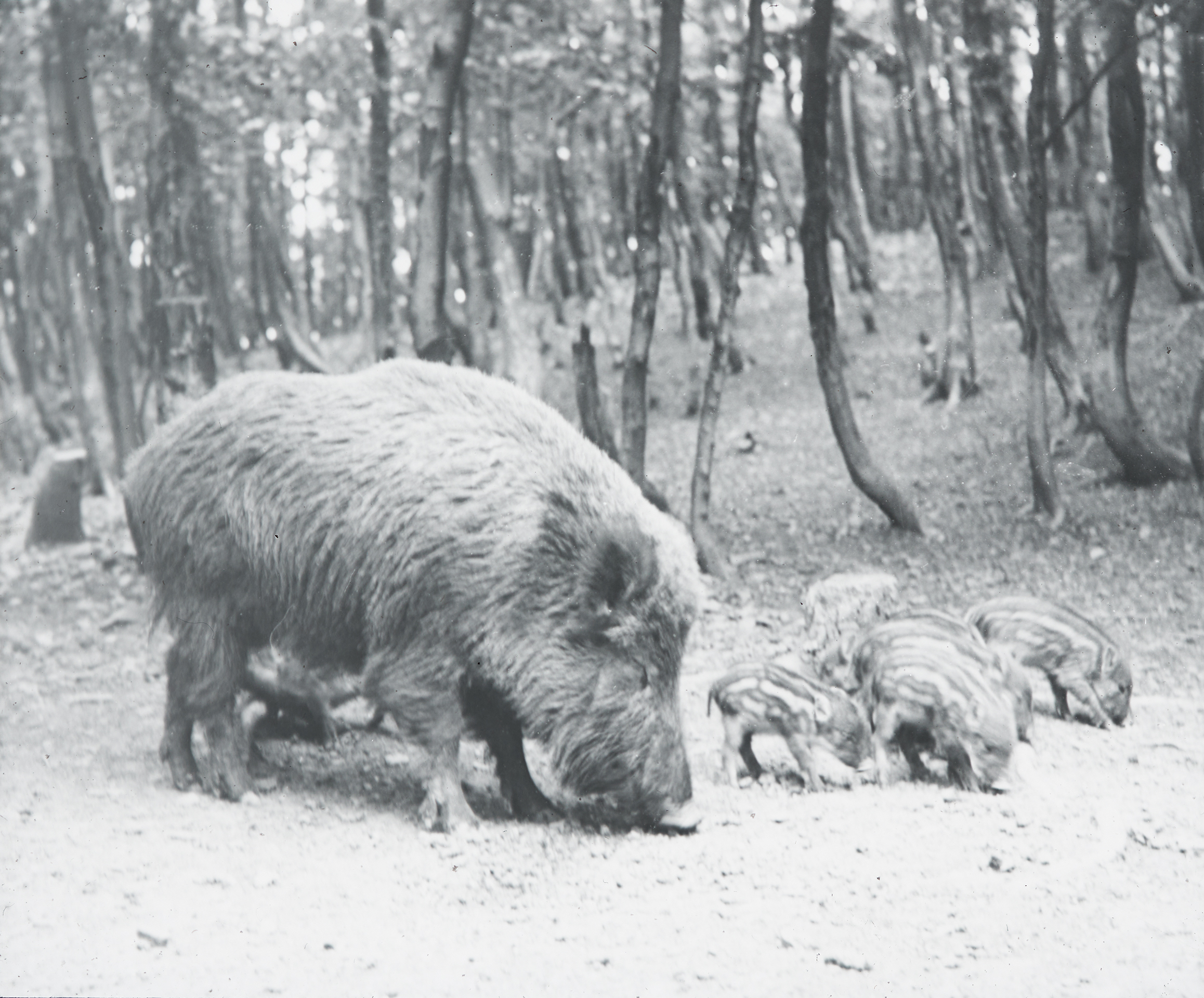 Ein weibliches Wildschwein (sogenannt Bache) und mehrere junge Wildschweine im Wald.