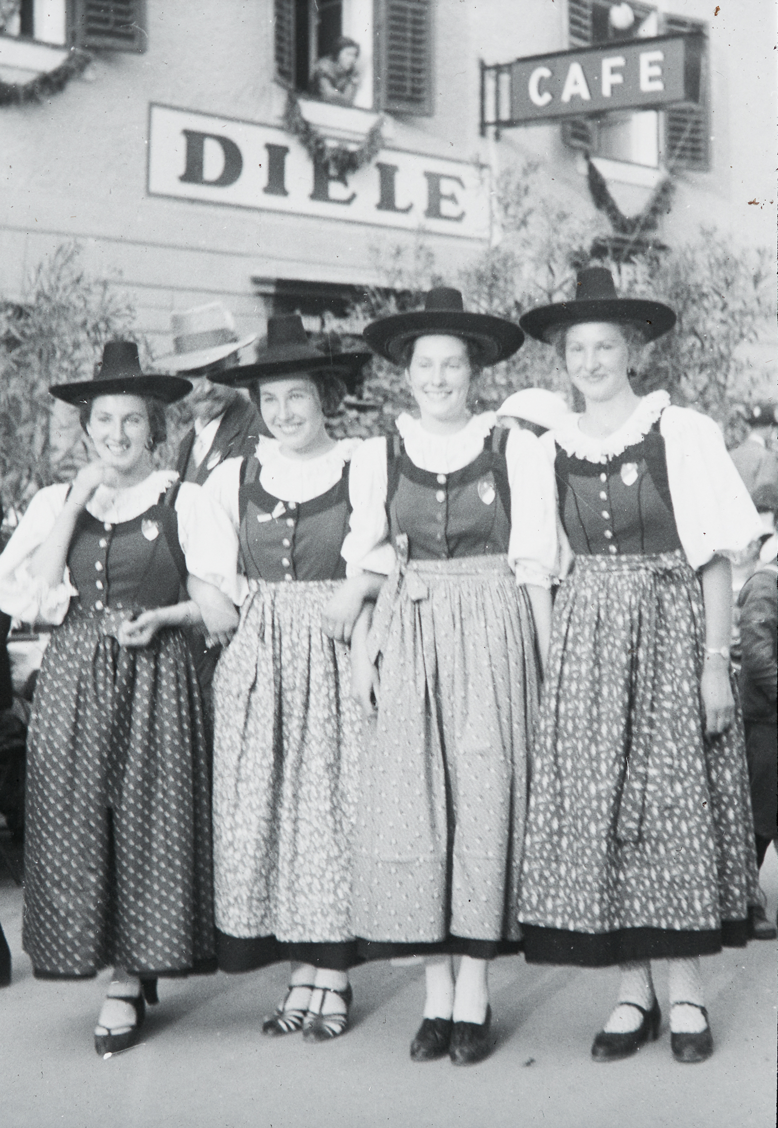 Diese Gruppe, bestehend aus vier Frauen, trägt traditionelle Trachtenkleidung. Auf den Köpfen tragen sie spezielle Hüte.