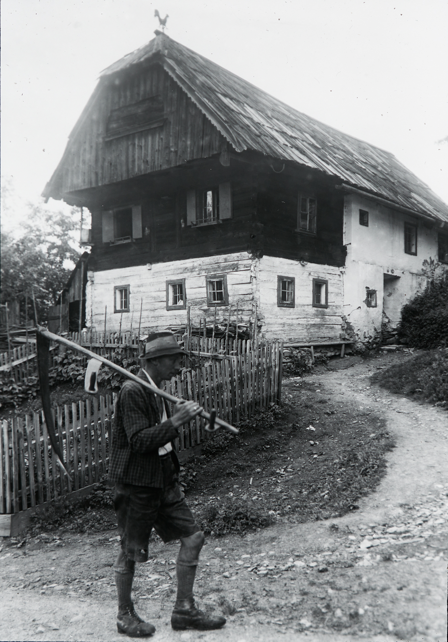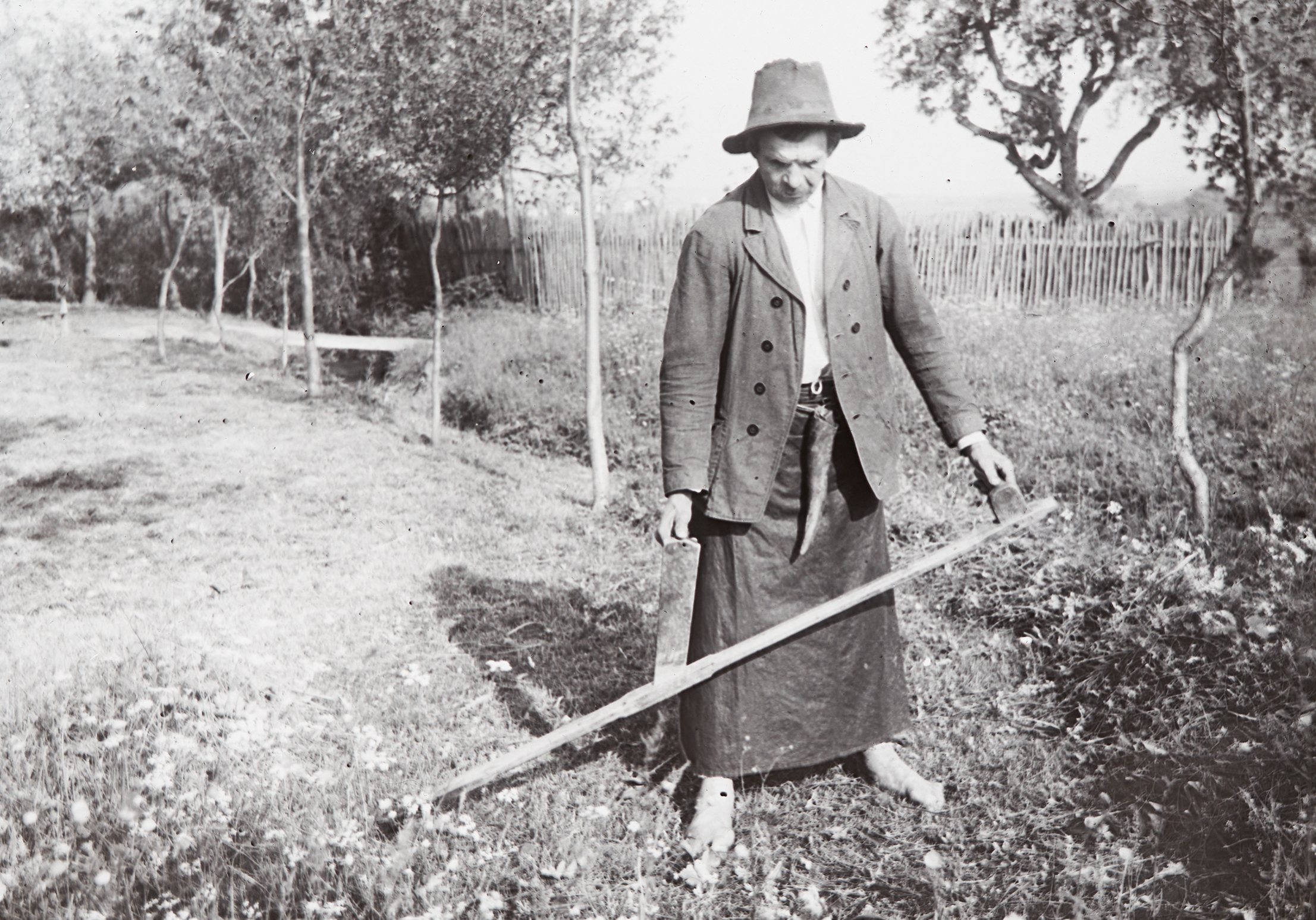 Dieser Mann hat eine Sense auf der Schulter liegen. Im Hintergrund sieht man ein großes Haus und einen mit Holz eingezäunten Garten.