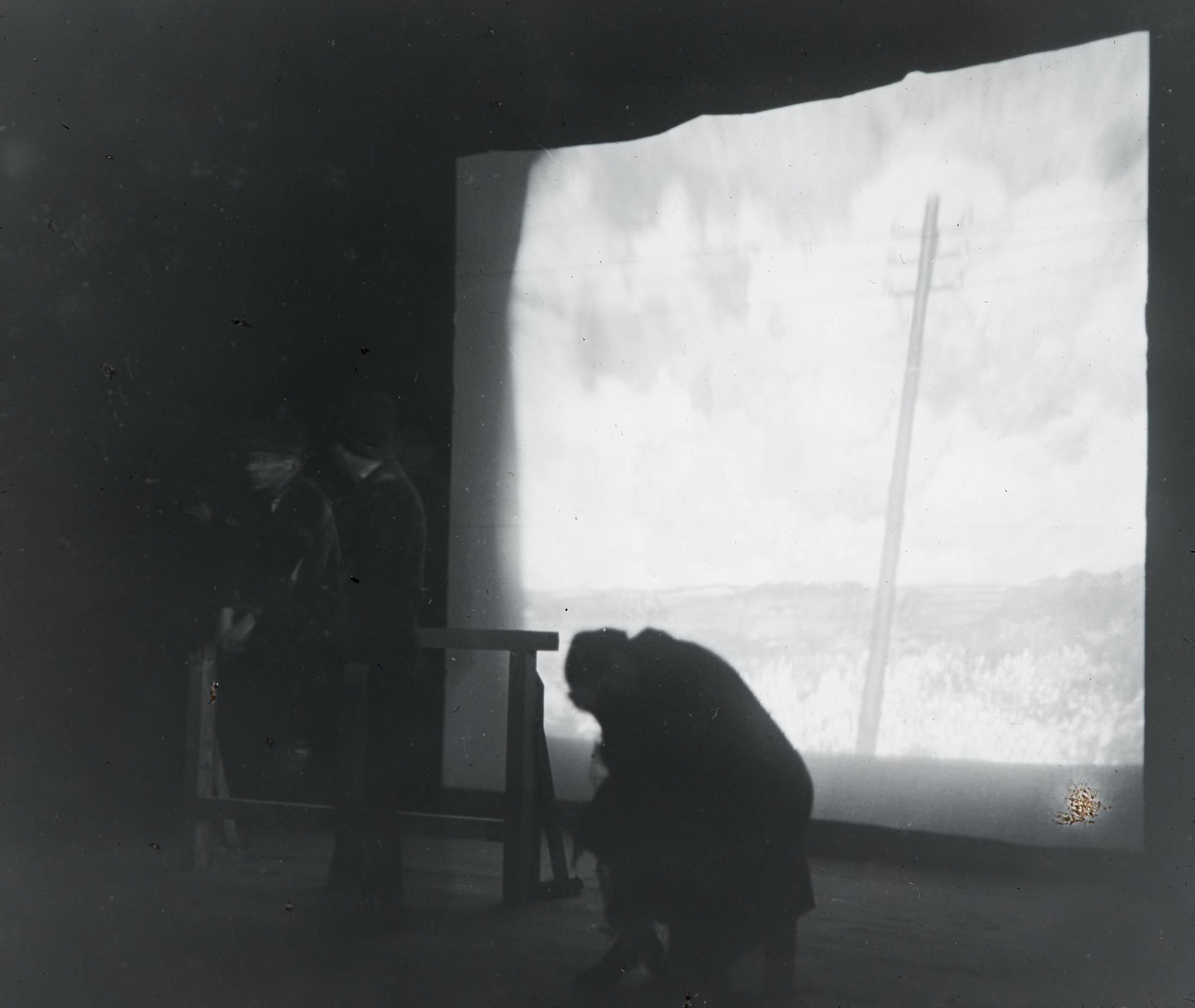 Auf diese Leinwand wird ein Strommasten projeziert.