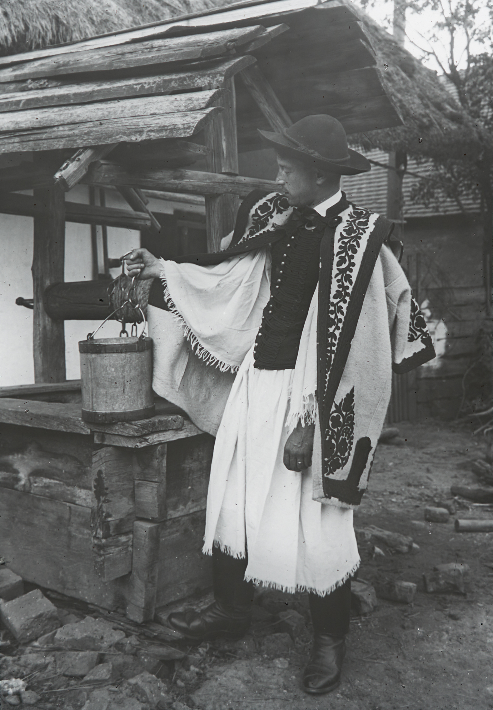 Dieser traditionell ungarisch gekleidete Bauer schöpft mit einem Kübel Wasser aus dem Brunnen.