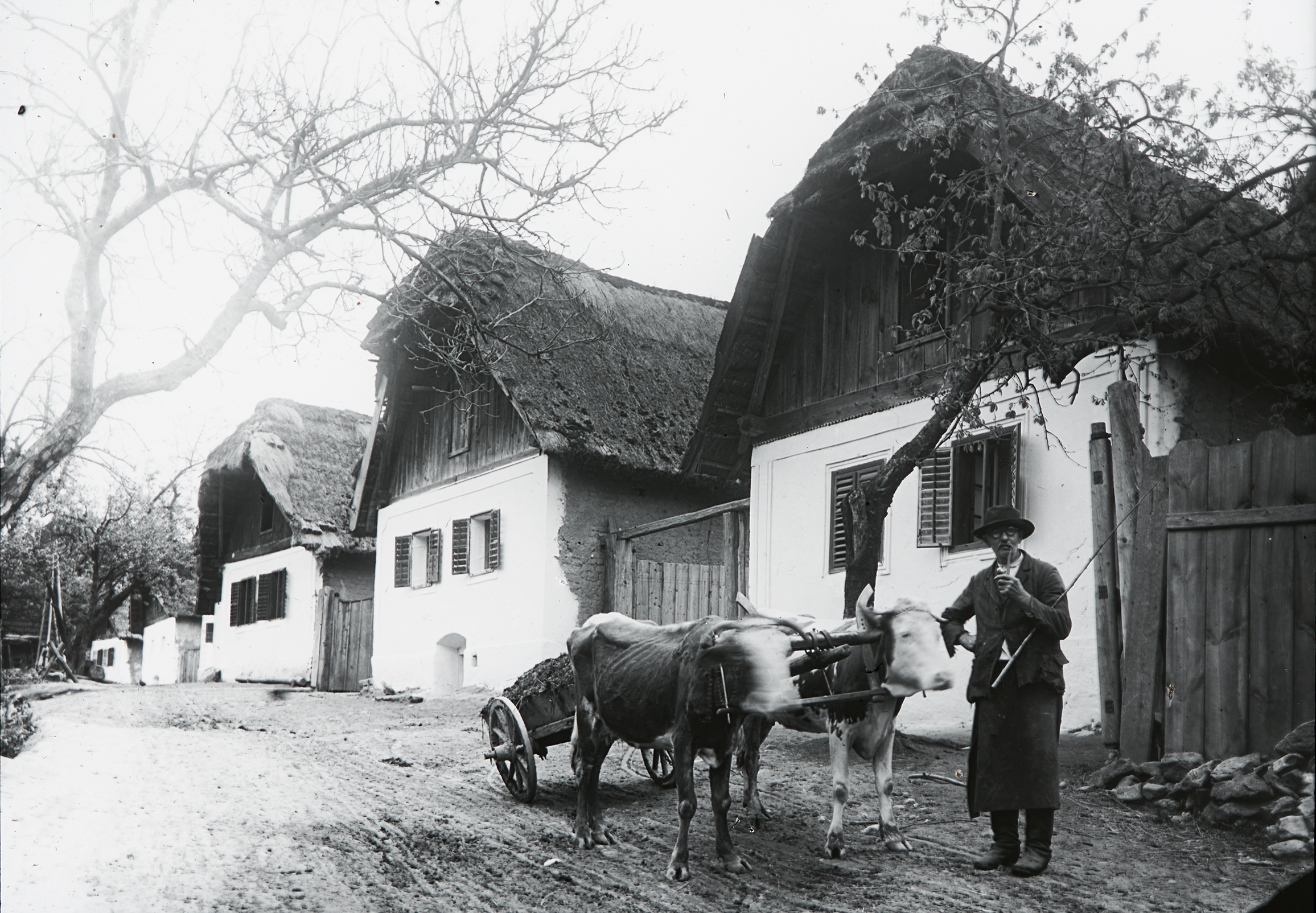 Diese Kühe ziehen einen Wagen über diesen Weg. Im Hintergrund erkennt man eine Reihe an Häusern. Neben dem Wagen steht ein Mann, der die Kühe antreibt.