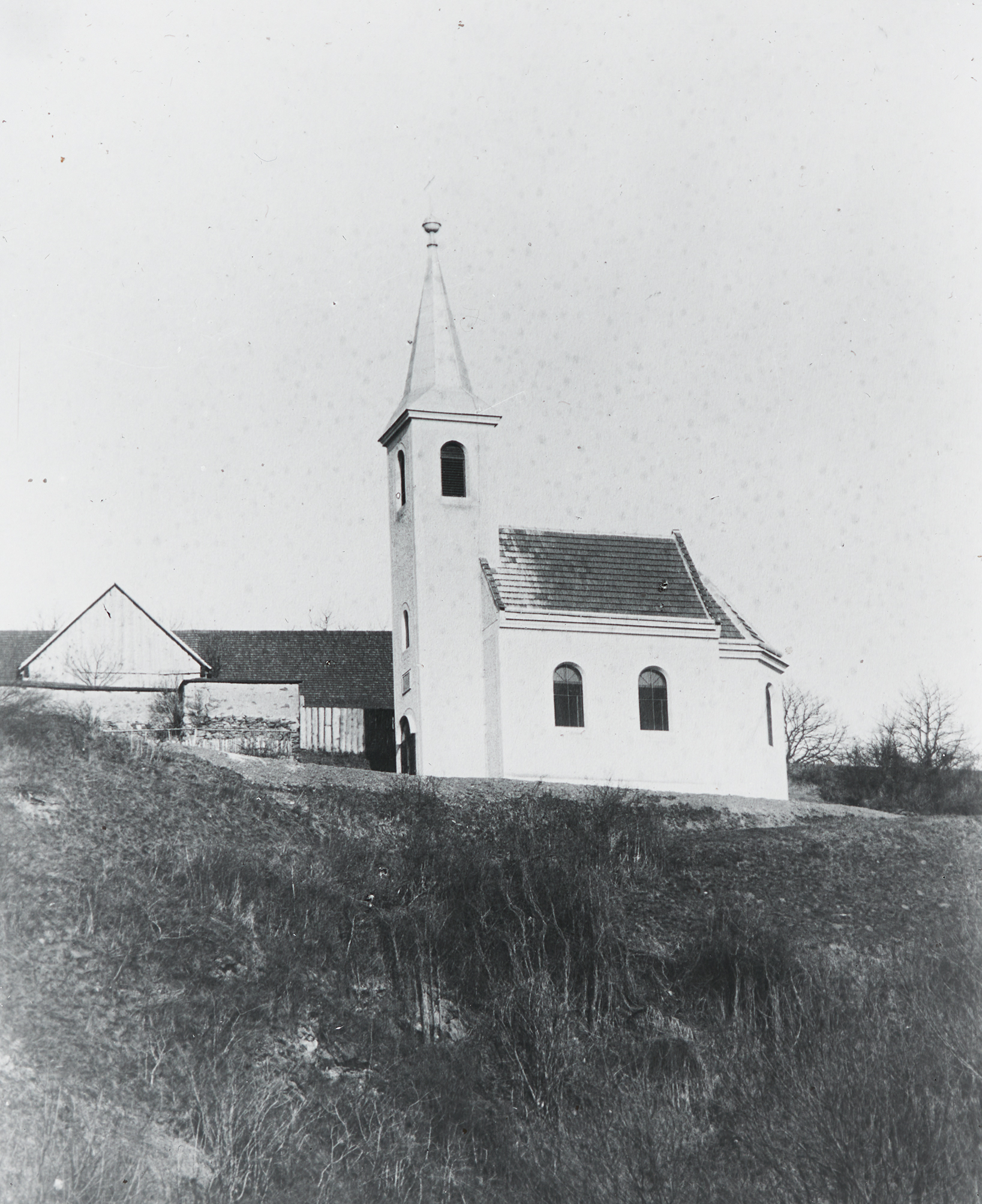 Hier erkennt man eine kleine Kapelle, die neben einem Haus steht.