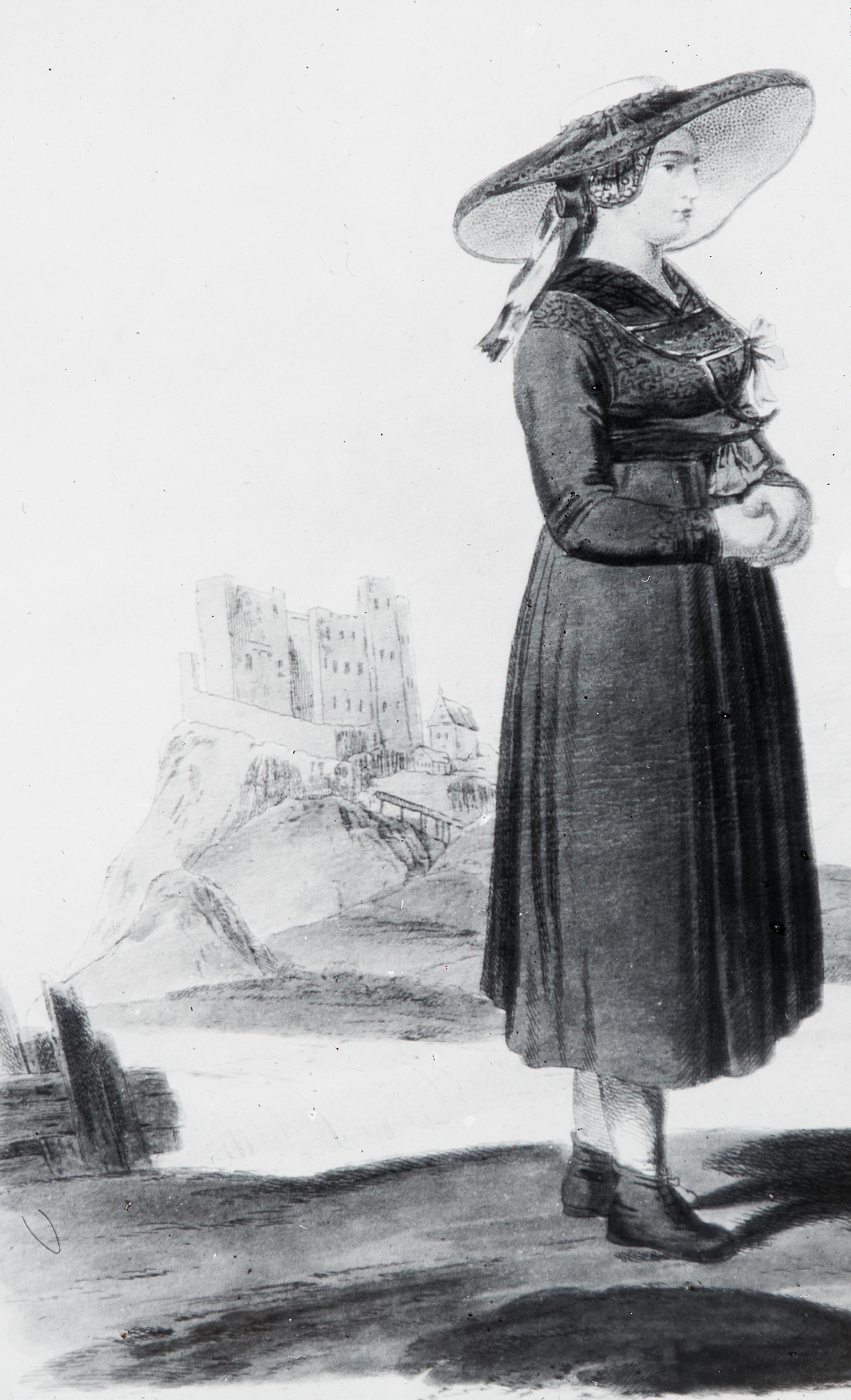 Diese Zeichnung zeigt die traditionelle Bekleidung des Pustertals. Das Pustertal befindet sich an der Grenze von Osttirol und Südtirol. Ein Großteil des Tals liegt in Südtirol.