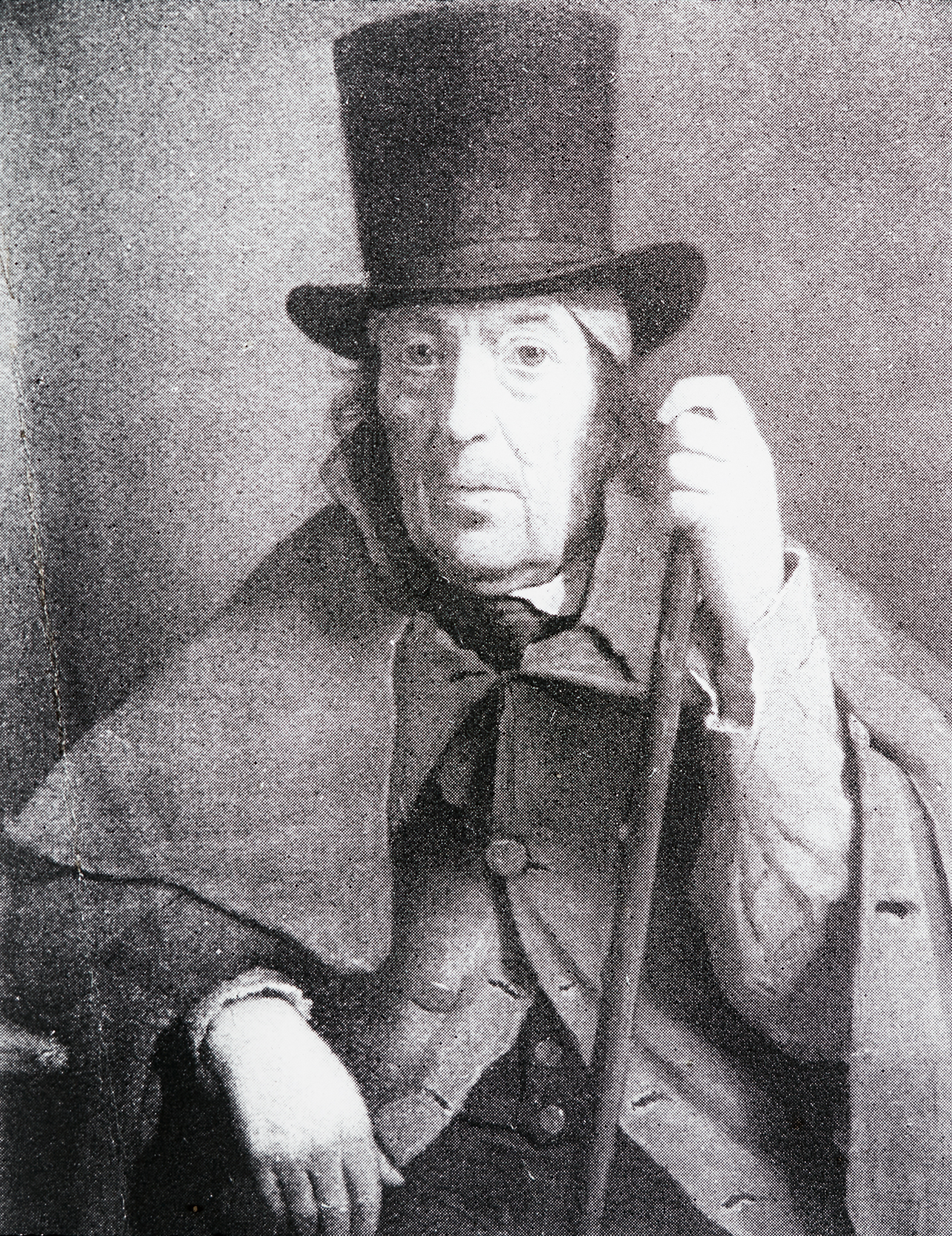 Die Portraitzeichnung eines Mannes mit Hut. Er hält ein Buch in der linken Hand.