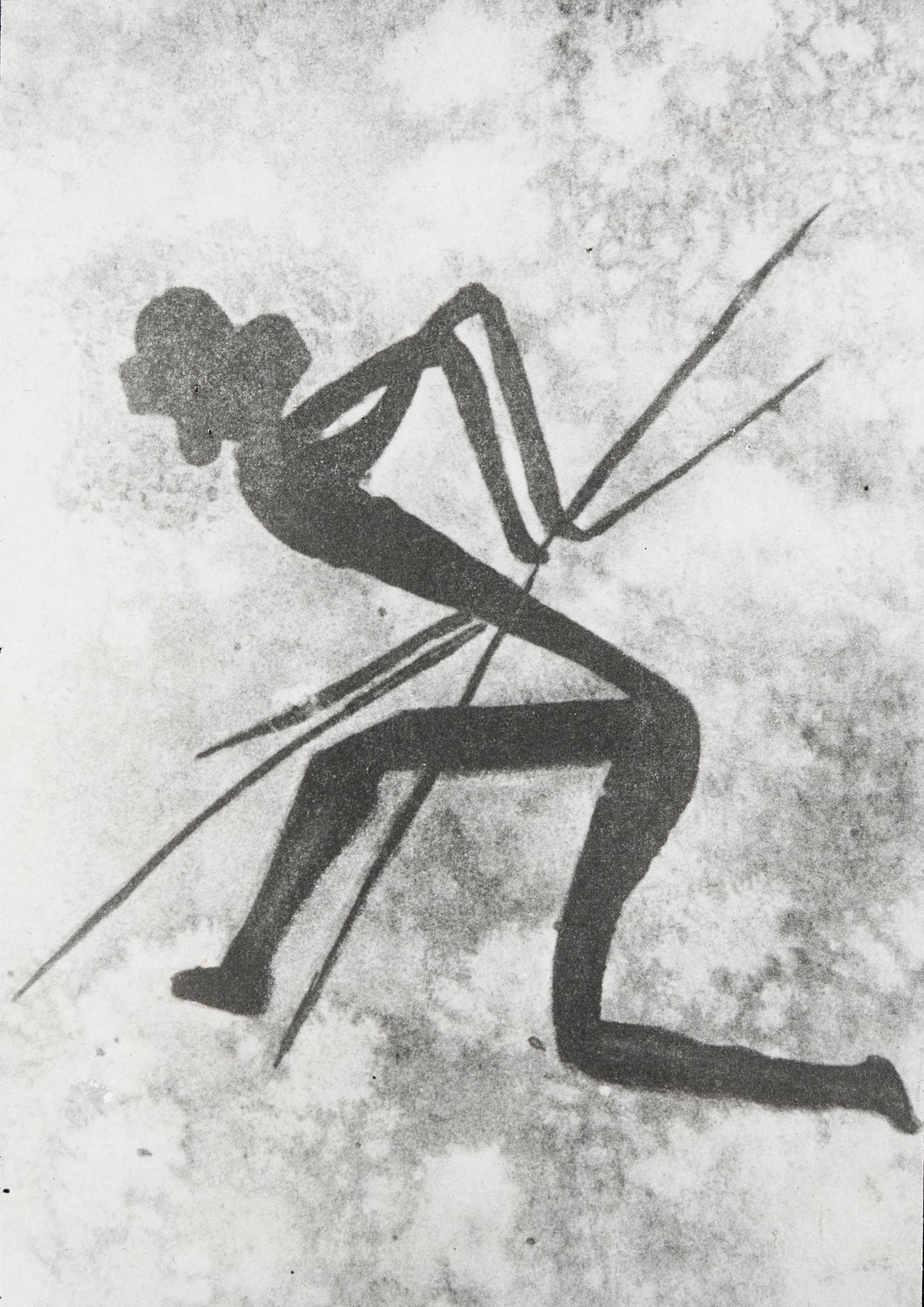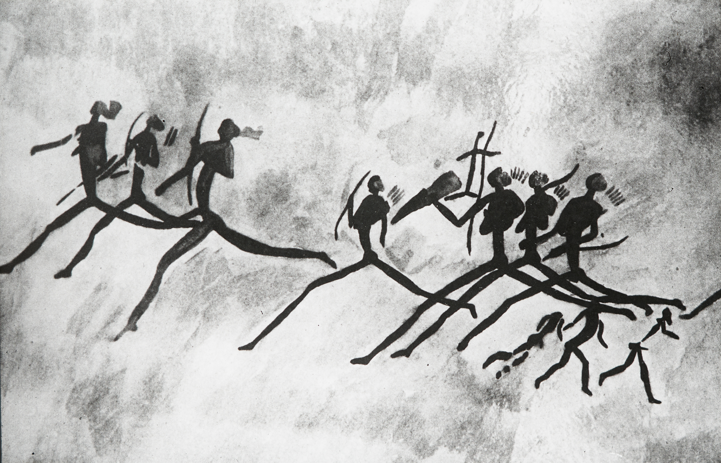 Diese Höhlenmalerei stammt aus Mosambik. Sie zeigt Krieger, die mit Speeren und Pfeil und Bogen bewaffnet sind.