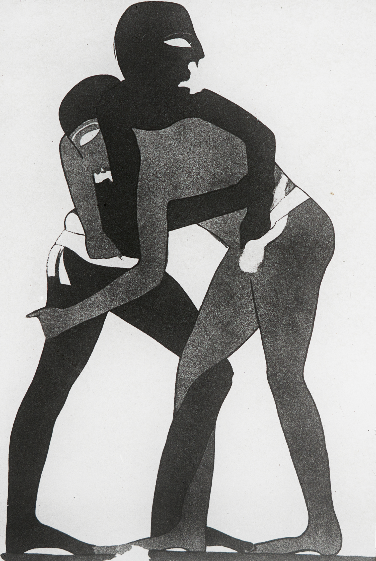 Diese Wandmalerei zeigt zwei Menschen beim Wrestling-Kampf. DIe Malerei stammt aus dem 15. Grab der Fundstelle in Beni Hasan