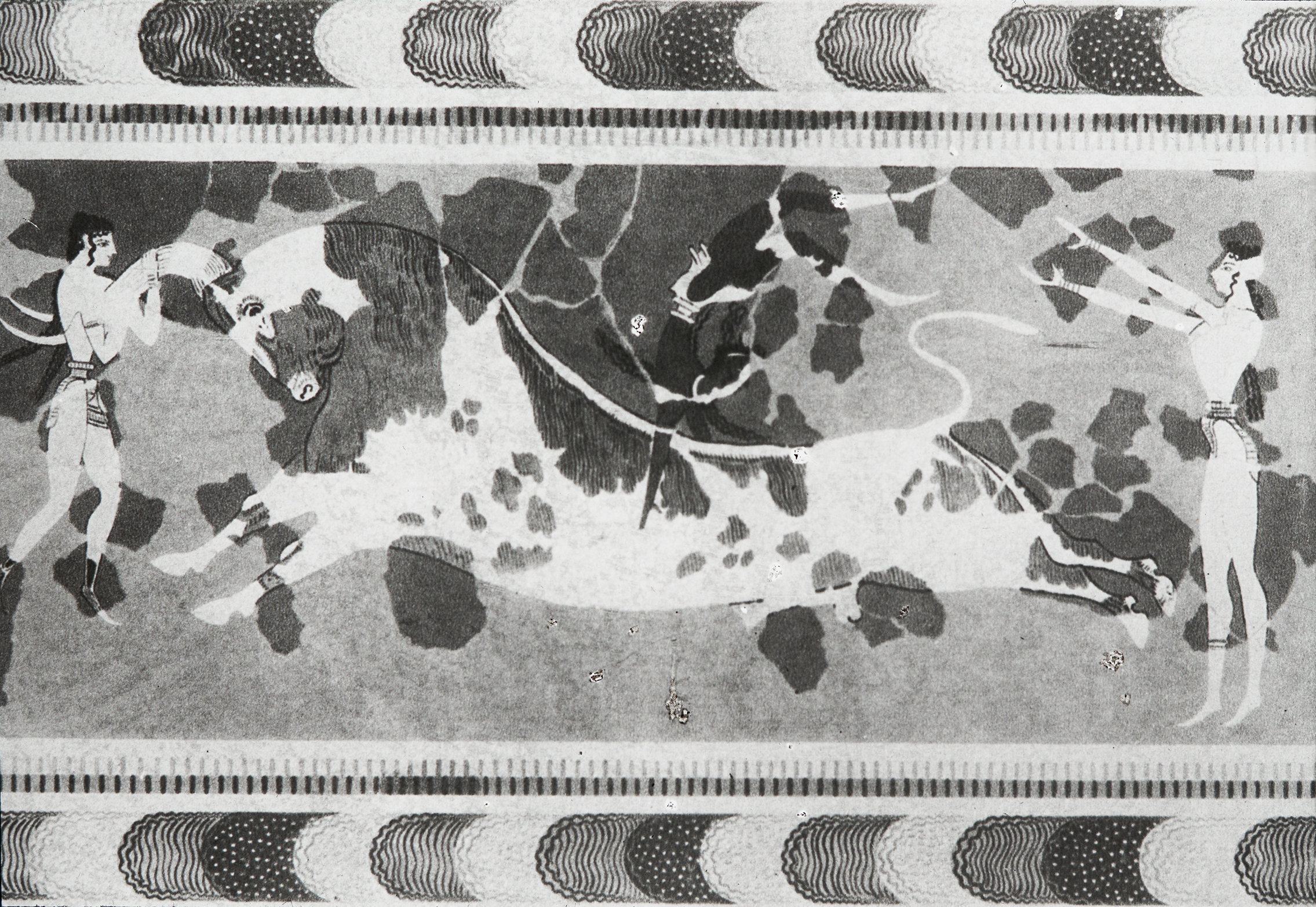 Diese Malerei stammt aus den Ruinen des Palast von Knossos. Es zeigt einen jungen Mann, der über einen Stier springt.