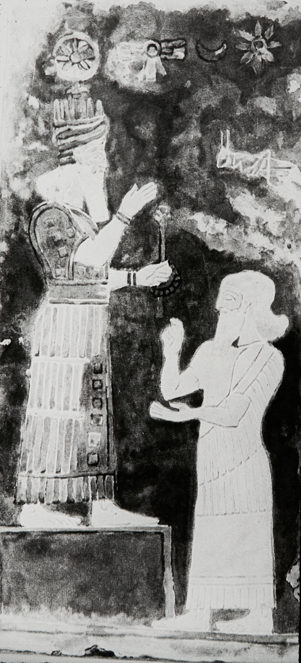Diese Malerei zeigt den assyrischen Gott Aššur. Dieser ist die Verkörperung der Stadt Aššur, eine Stadt im heutigen Gebiet des Irak.