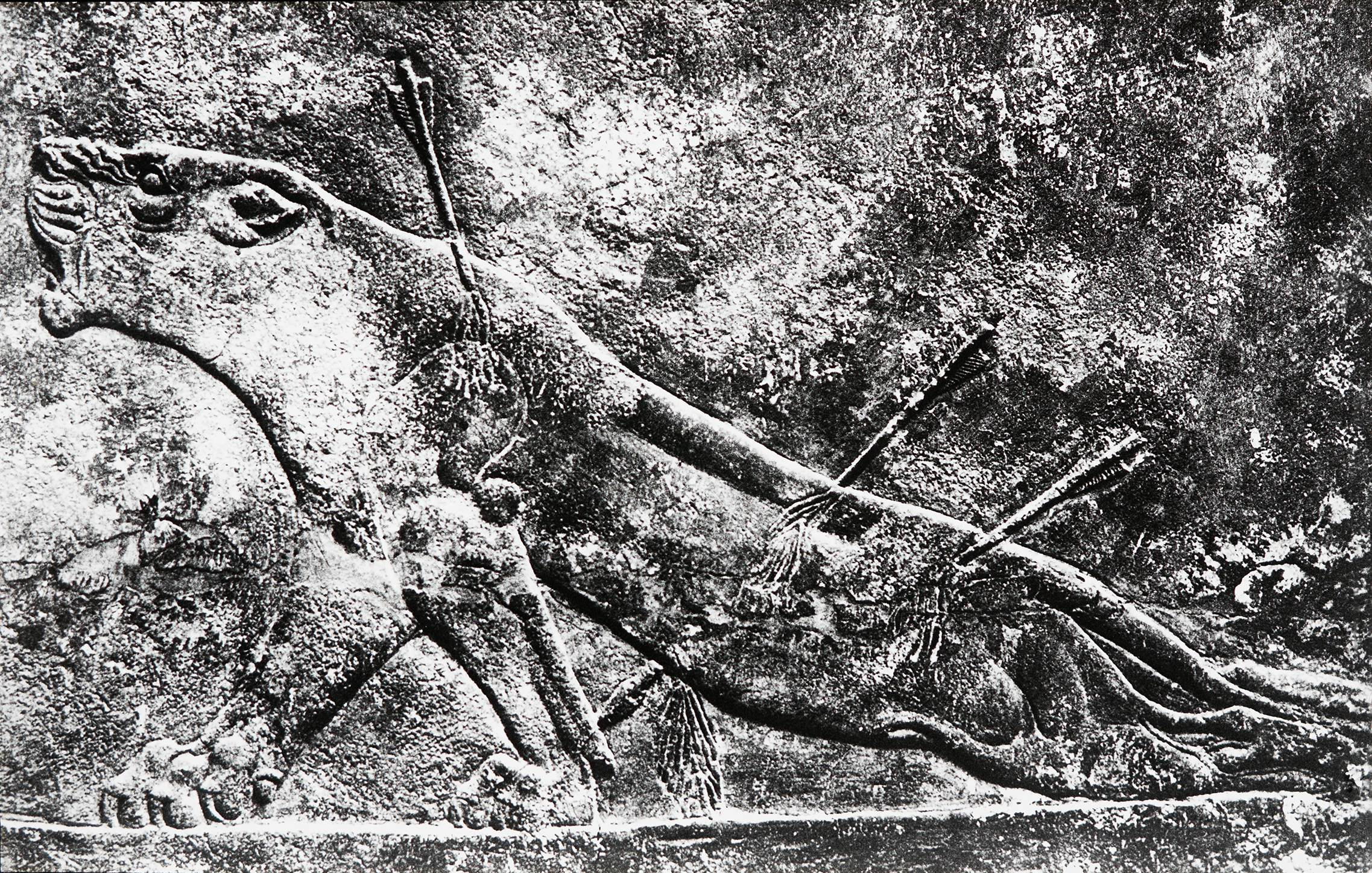 Dieses Steinbild zeigt eine Löwin, die von mehreren Pfeilen erwischt wurde.
