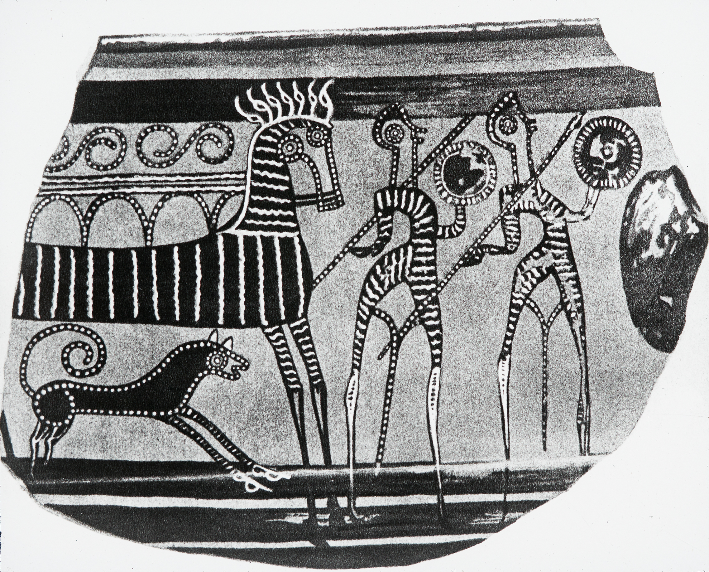 Auf dieser antiken griechischen Vase sind zwei Krieger mit Speeren und Schildern zu sehen. Daneben erkennt man ein Pferd und einen Hund.