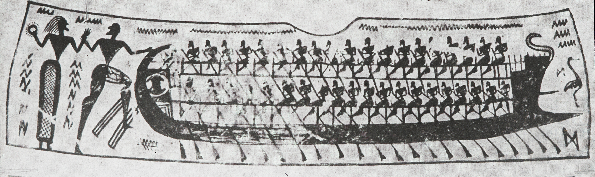 Dieser spätgeometrische Krater wurde in Theben gefunden. Er zeigt ein Schiff mit Menschen, die rudern.