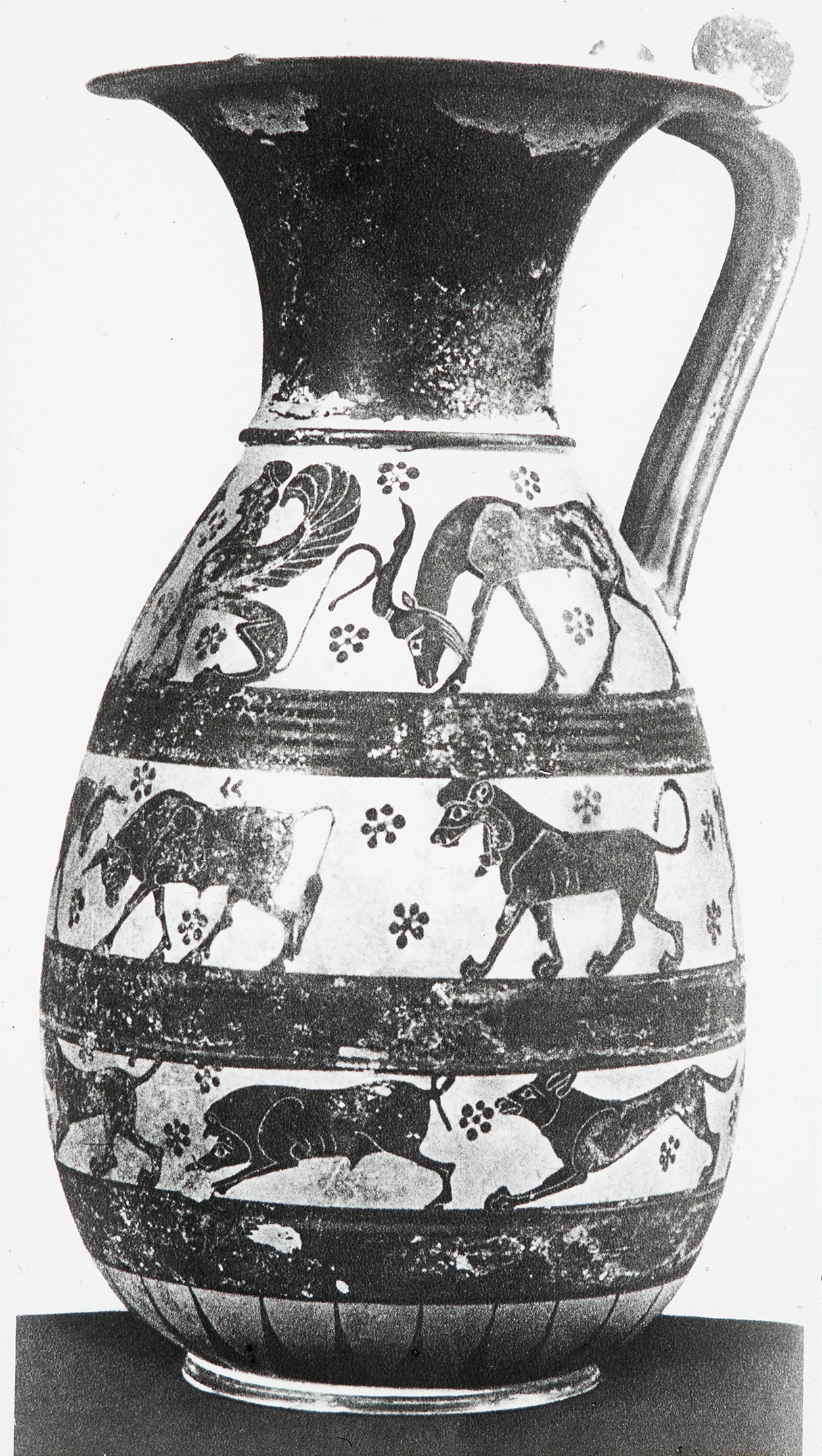 Diese korinthische Vase wurde mit Zeichnungen verschiedener Tiere verziert.