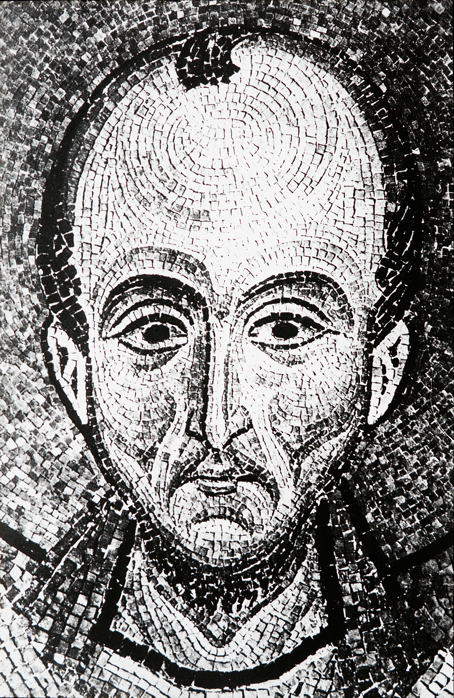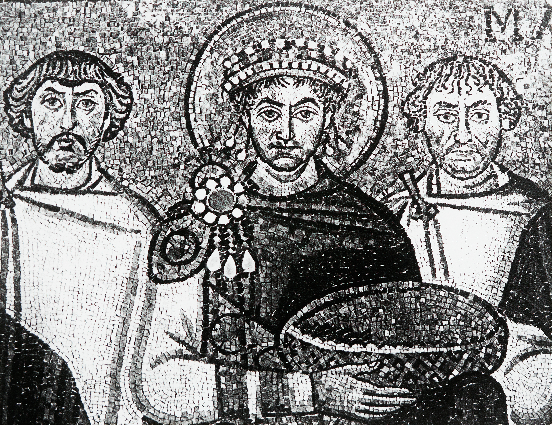 Dieses Mosaik befindet sich in der Kirche San Vitale in Ravenna. Es zeigt Justinian I. (in der Mitte), ein römischer Kaiser. Er lebte von 482 bis 565 nach Christus. Er regierte von 527 bis zu seinem Tod.
