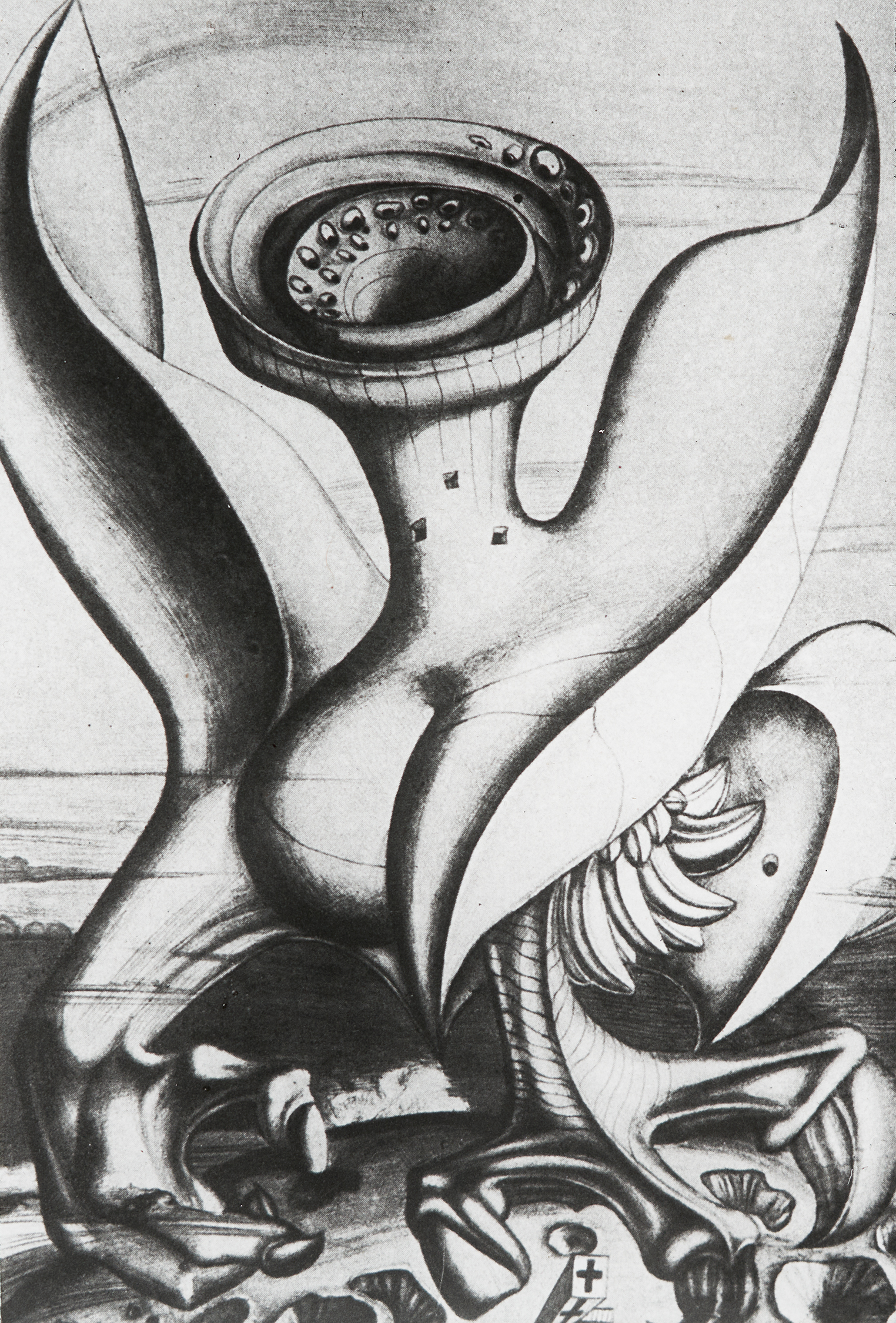 Auf dieser Zeichnung befindet sich unter anderem ein Vasen-ähnliches Konstrukt, eine Hand und ein Bananenbüschel.