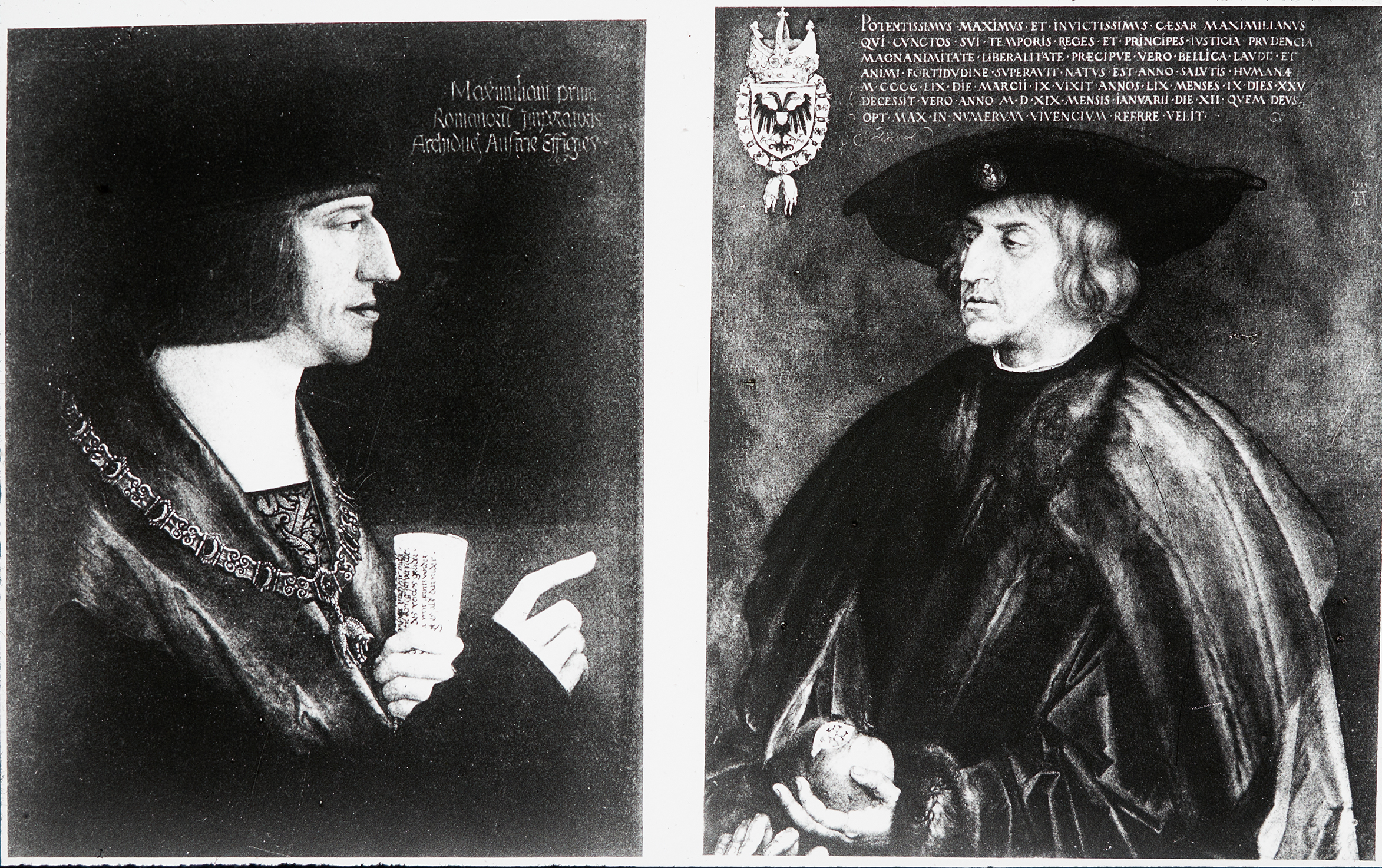 Albrecht Dürer arbeitete mehrmals mit Kaiser Maximilian I. zusammen. Hier zu sehen sind zwei Seitenansichten des Kaisers. Maximilian I. lebte von 1459 bis 1519.