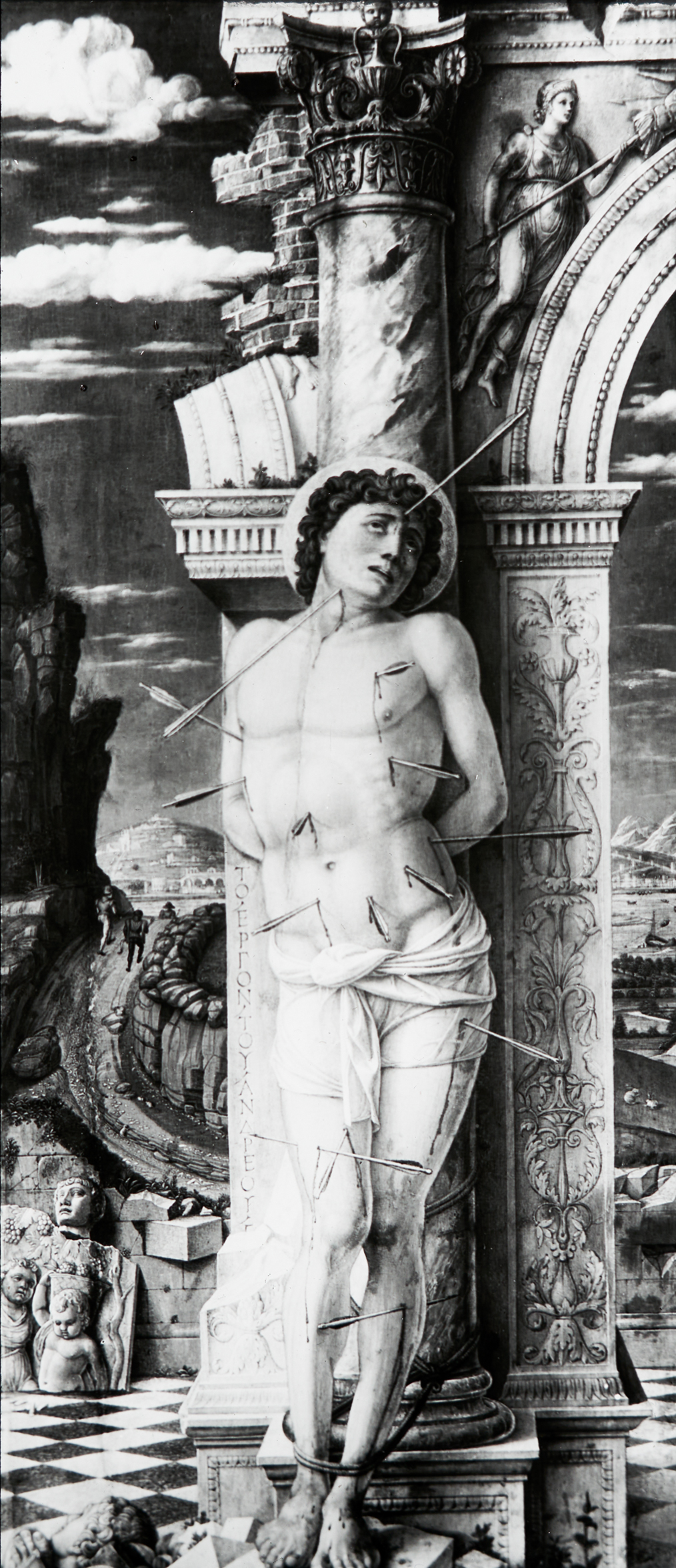 Andrea Mantegna ist ein Maler der italienischen Frührenaissance. Er malte insgesamt drei Gemälde über den heiligen Sebastian. Der heilige Sebastian war ein Märtyrer der christlichen Religion, er gilt als Schutzpatron vor der Pest. Sebastian wurde bei seinem Tod an einen Pfahl gebunden und mit Pfeilen erschossen.