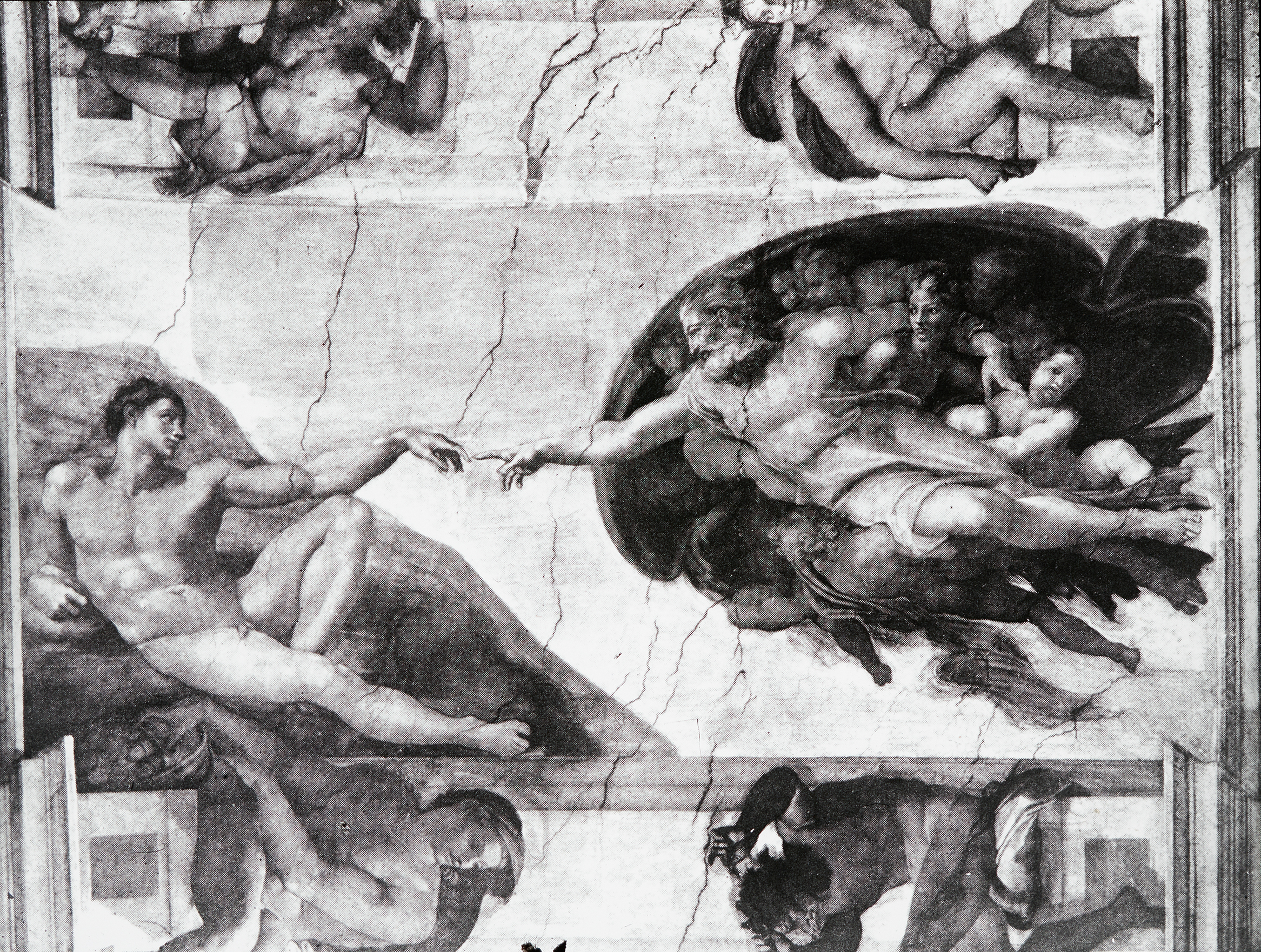 Michelangelo lebte von 1475 bis 1564. "Die Erschaffung Adams" befindet sich an der Decke der sixtinischen Kapelle in der Vatikanstadt. Die religiöse Figur Adam wird durch den ausgestreckten Finger von Gott zum Leben erweckt.