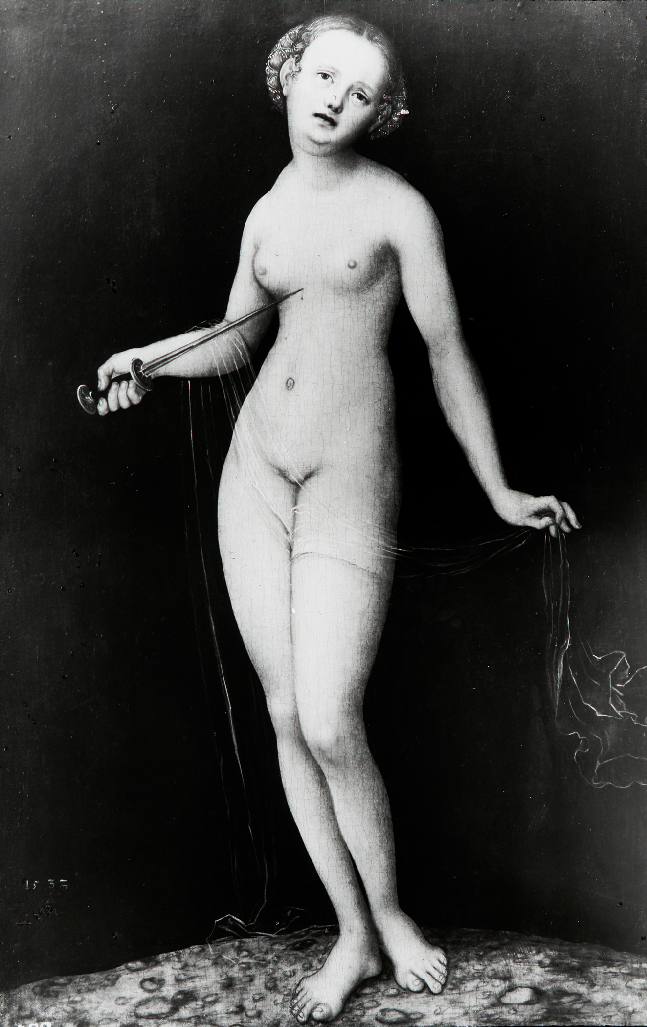 Lucas Cranach der Ältere lebte von 1472 bis 1553. Er malte 1532 das Gemälde "Lucretia", welches die Lucretia zeigt, eine Figur der römischen mythischen Frühzeit. Lucretia wurde von Tarquinius vergewaltigt, daraufhin stieß sie sich ein Messer ins Herz, um nicht mit dieser Sünde leben zu müssen. Dies tat sie, obwohl ihr Ehemann ihr versicherte, dass ihr keine Schuld zukäme.