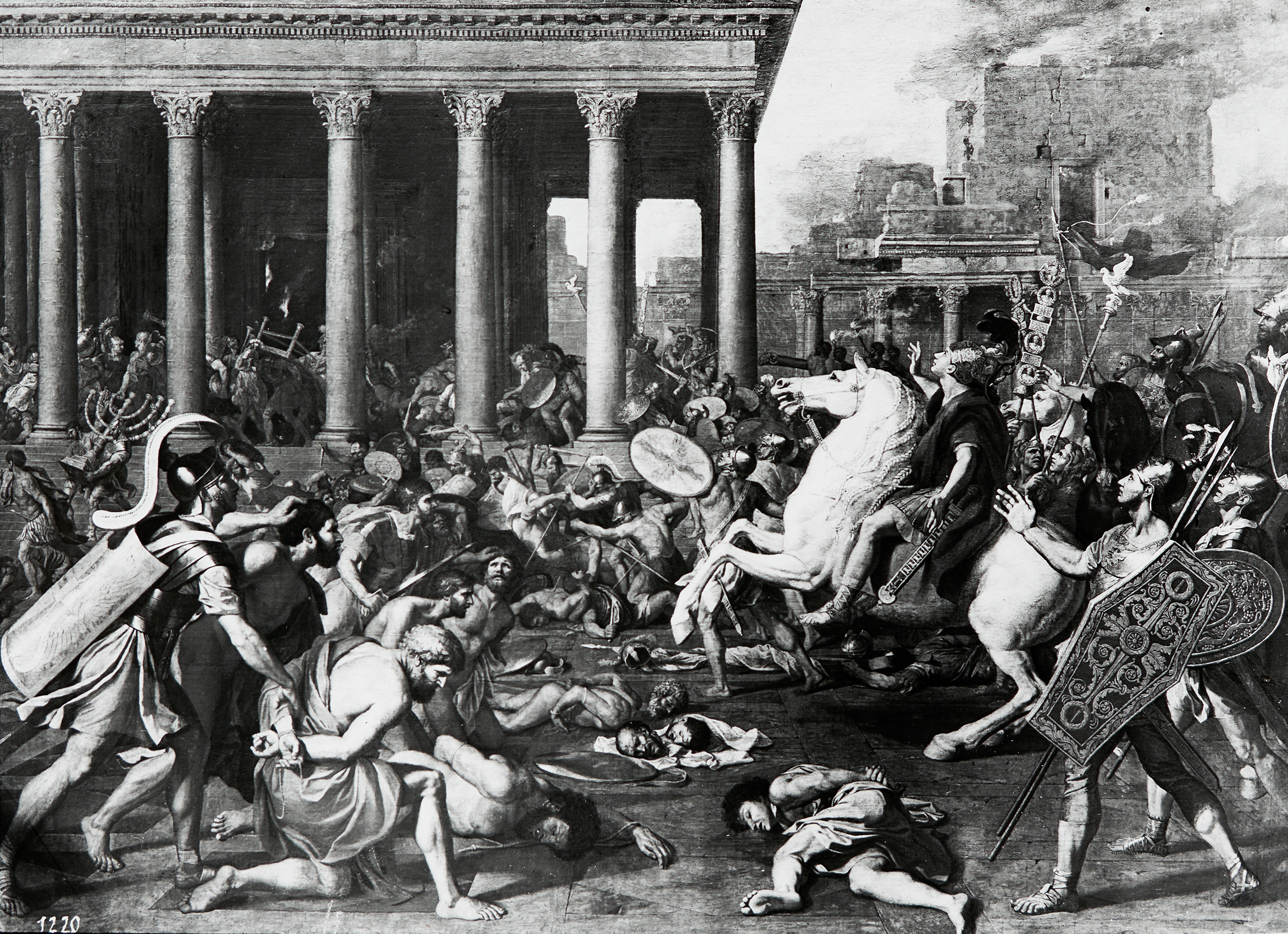 Nicolas Poussin lebte von 1594 bis 1665. Das Gemälde "Zerstörung des Tempels in Jerusalem durch Titus" entstand 1635 und zeigt den Angriff des römischen Kaisers Titus auf Jerusalem.