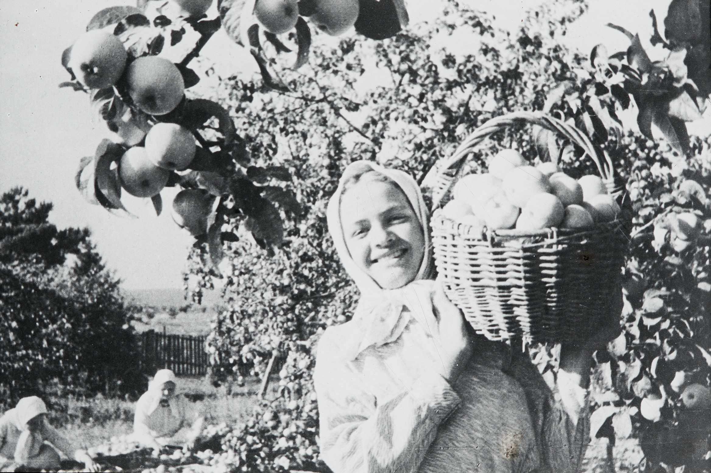 Diese Frau lächelt in die Kamera, während sie einen Korb voller frisch gepflückter Äpfel schultert. Im Hintergrund erkennt man zwei weitere Personen, die die Äpfel sortieren.