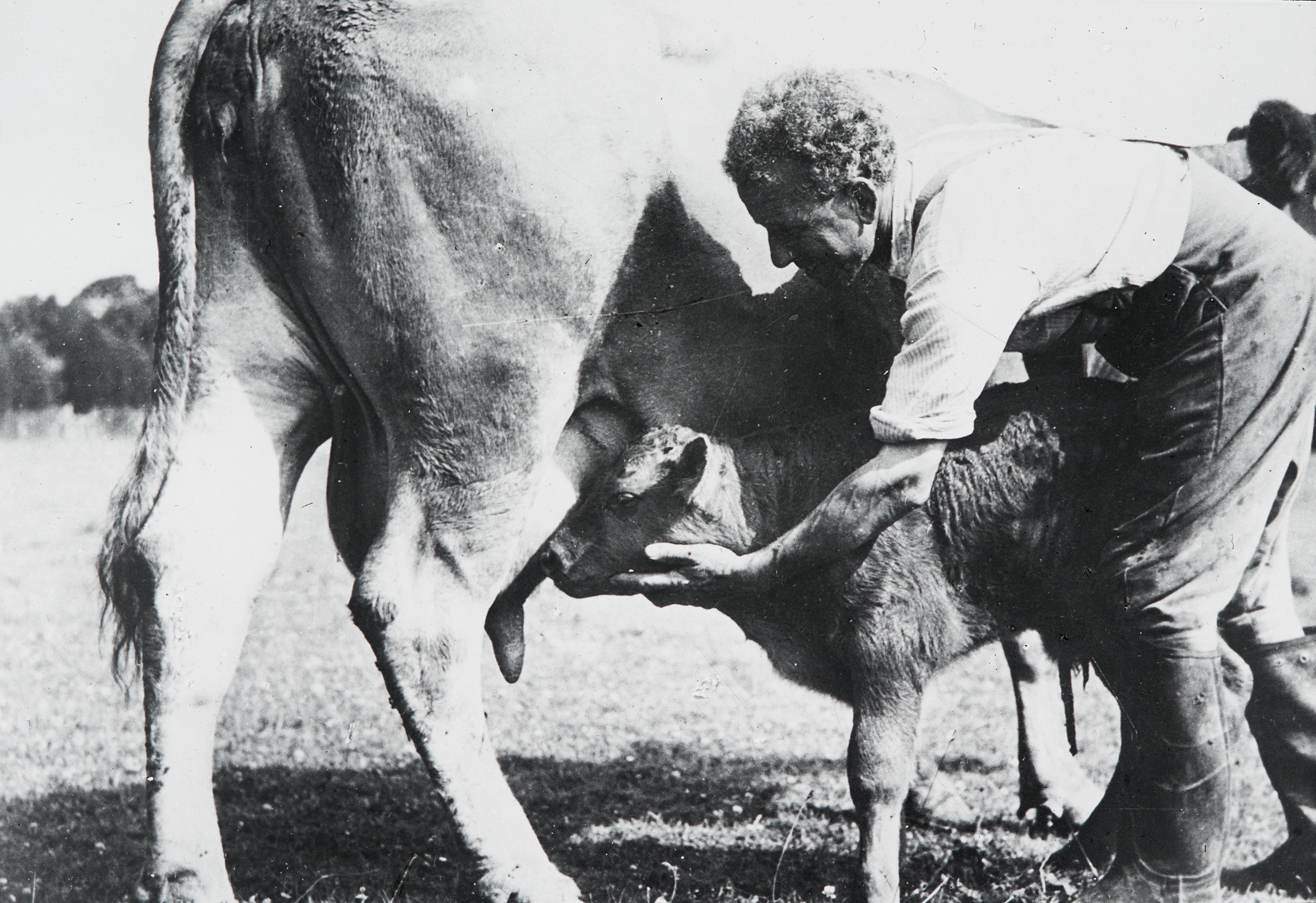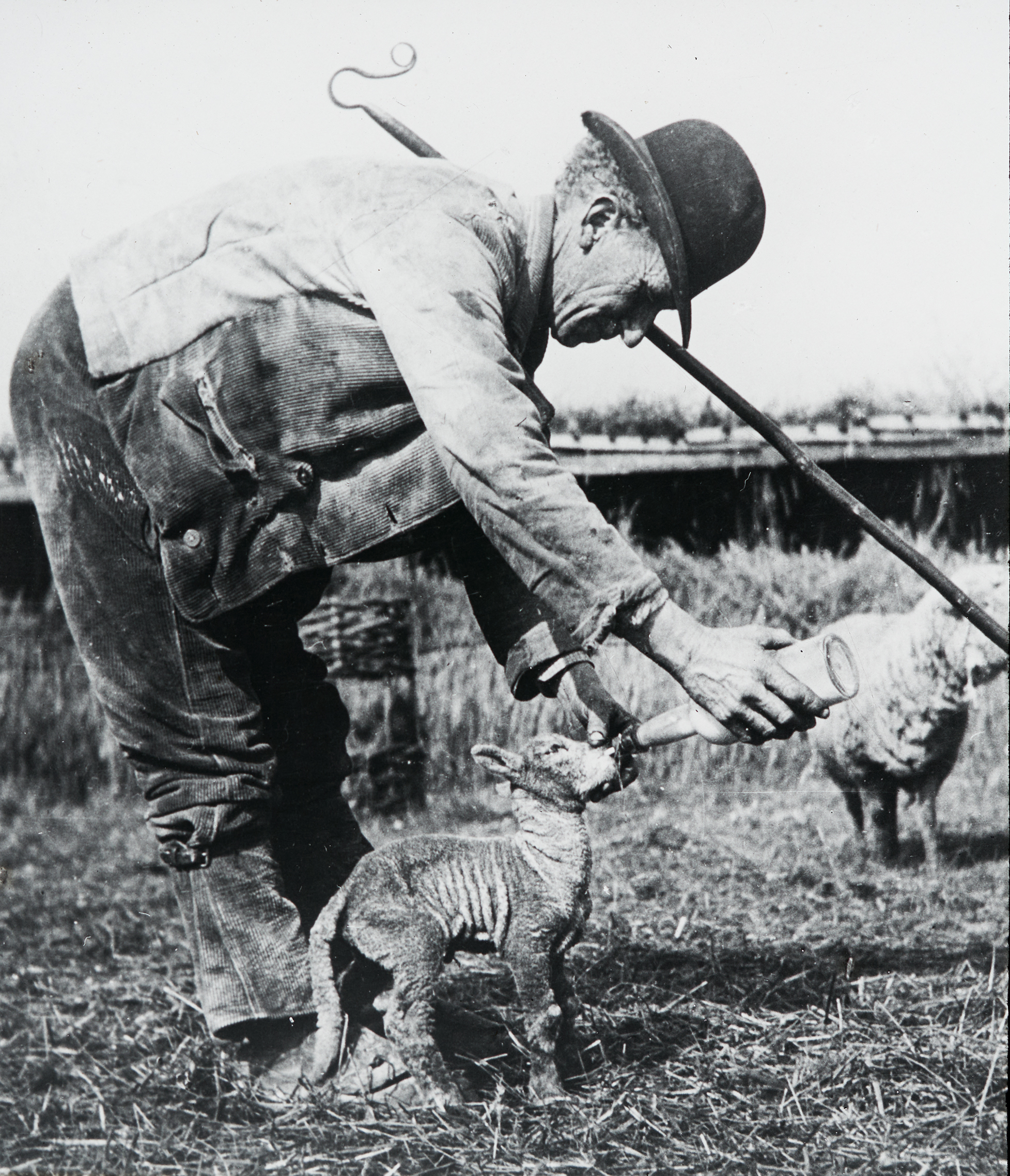Dieser Bauer füttert ein Jungtier mit der Flasche.