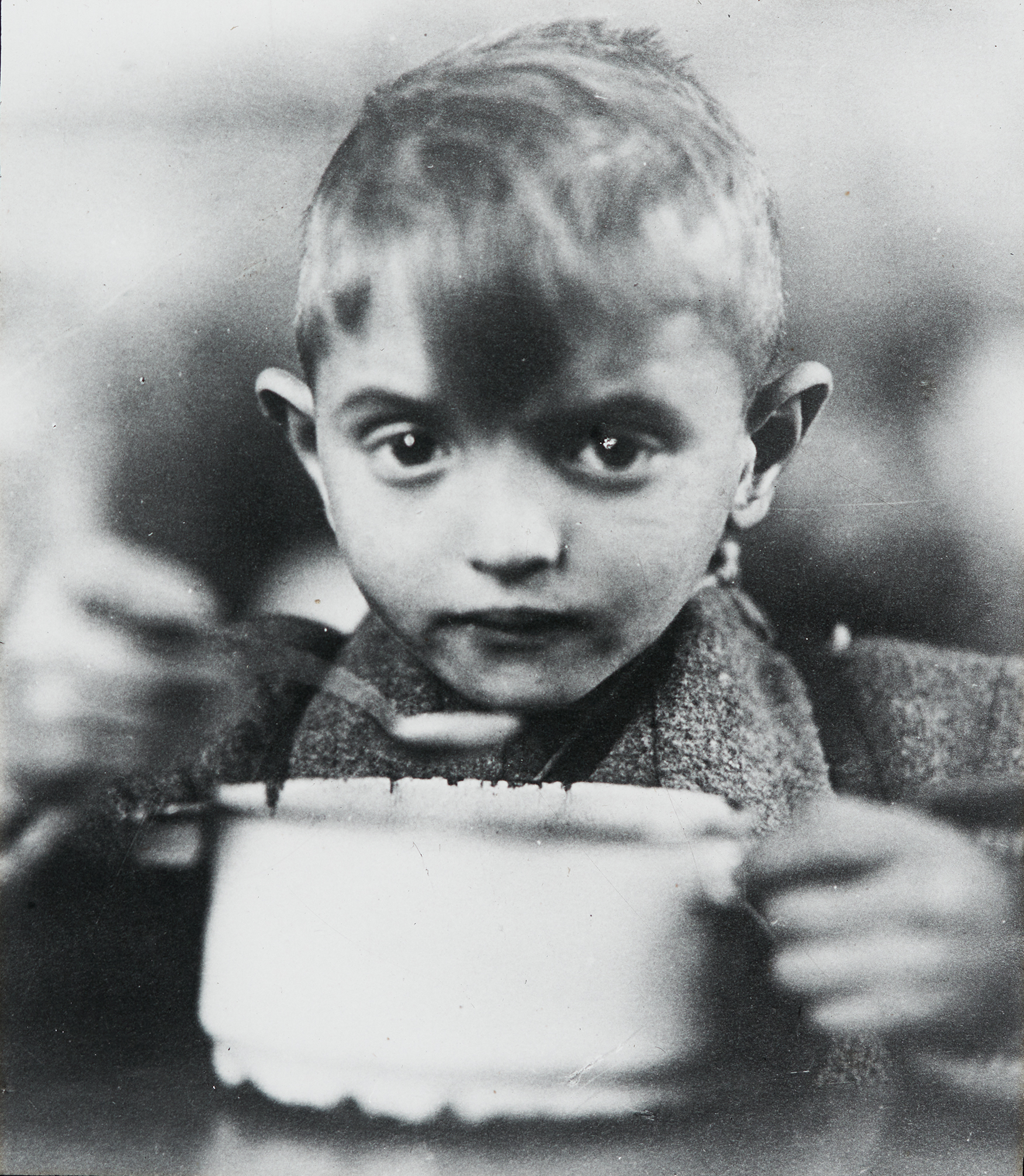 Dieser Junge wurde während er isst fotografiert. Er löffelt etwas aus einer Schale, die er vor sich stehen hat.